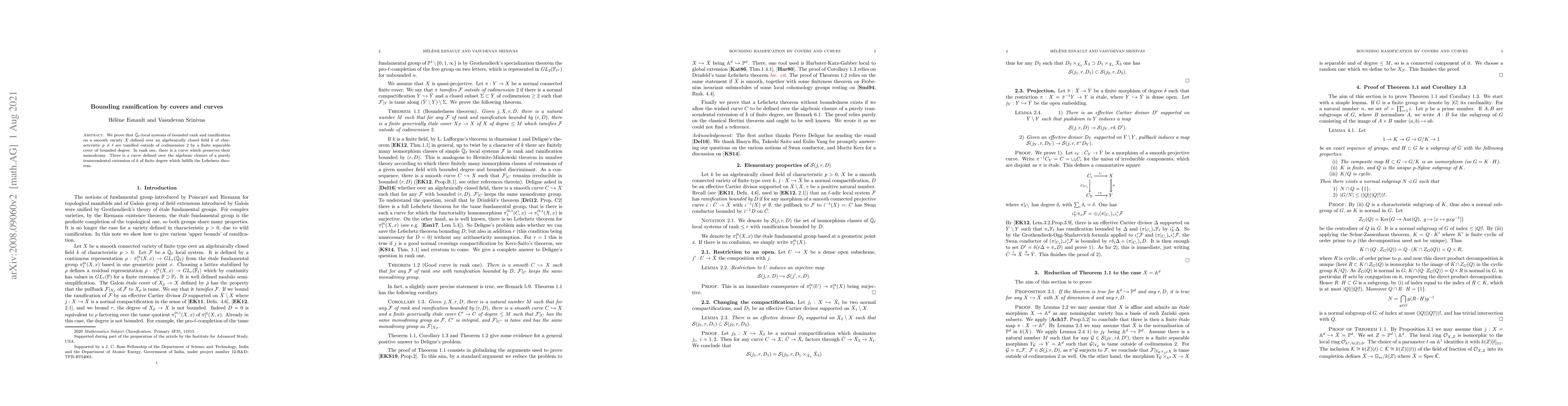 We prove that $\bar {\mathbb Q}_\ell$-local systems of bounded rank and ramification on a smooth variety $X$ defined over an algebraically closed field $k$ of characteristic $p\neq \ell$ are tamified outside of codimension $2$ by a finite separable cover of bounded degree. In rank one, there is a curve which preserves their monodromy. There is a curve defined over the algebraic closure of a purely transcendental extension of $k$ of finite degree which fulfills the Lefschetz theorem. Last version: minor typos corrected.