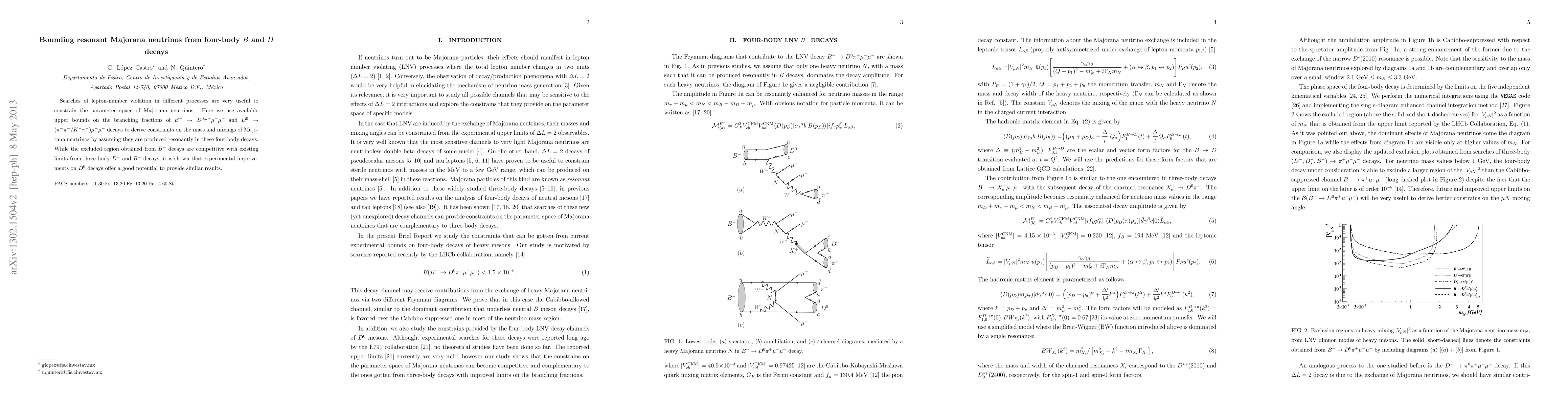 Searches of lepton-number violation in different processes are very useful to constrain the parameter space of Majorana neutrinos. Here we use available upper bounds on the branching fractions of B^- -> D^0pi^+mu^-mu^- and D^0 -> (pi^-pi^-/K^-pi^-) mu^-mu^- decays to derive constraints on the mass and mixings of Majorana neutrinos by assuming they are produced resonantly in these four-body decays. While the excluded region obtained from B^- decays are competitive with existing limits from three-body D^- and B^- decays, it is shown that experimental improvements on D^0 decays offer a good potential to provide similar results.