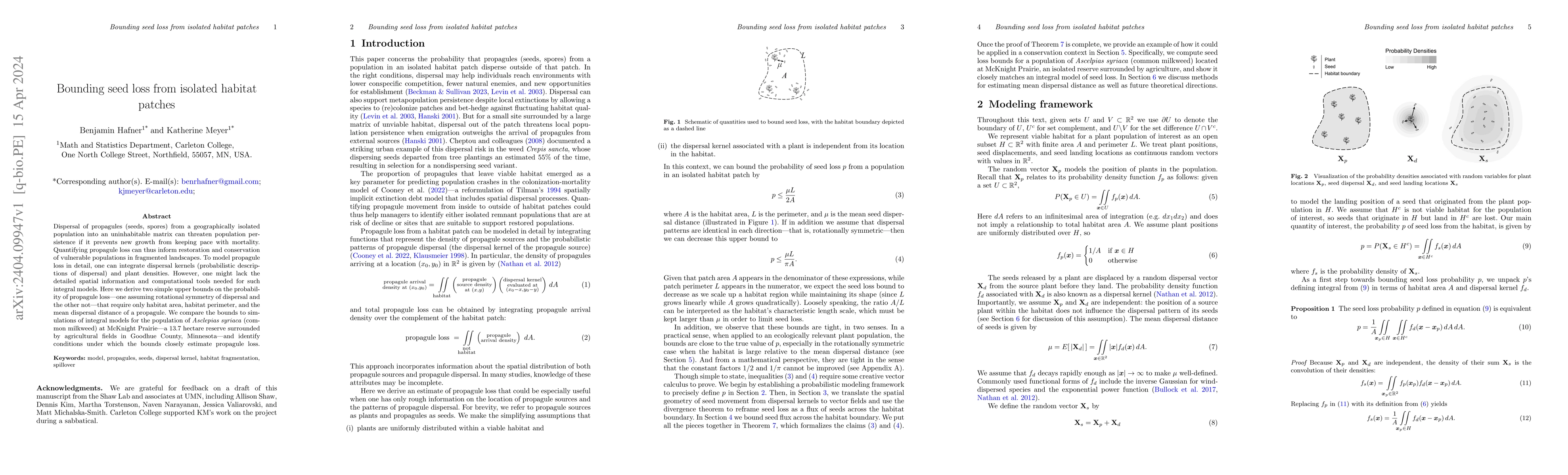 Dispersal of propagules (seeds, spores) from a geographically isolated population into an uninhabitable matrix can threaten population persistence if it prevents new growth from keeping pace with mortality. Quantifying propagule loss can thus inform restoration and conservation of vulnerable populations in fragmented landscapes. To model propagule loss in detail, one can integrate dispersal kernels (probabilistic descriptions of dispersal) and plant densities. However, one might lack the detailed spatial information and computational tools needed by such integral models. Here we derive two upper bounds on the probability of propagule loss--one assuming rotational symmetry of dispersal and the other not--that require only habitat area, habitat perimeter, and the mean dispersal distance of a propagule. We compare the bounds to simulations of integral models for the population of Asclepias syriaca (common milkweed) at McKnight Prairie--a 13.7 hectare reserve surrounded by agricultural fields in Goodhue County, Minnesota--and identify conditions under which the bounds closely estimate propagule loss.