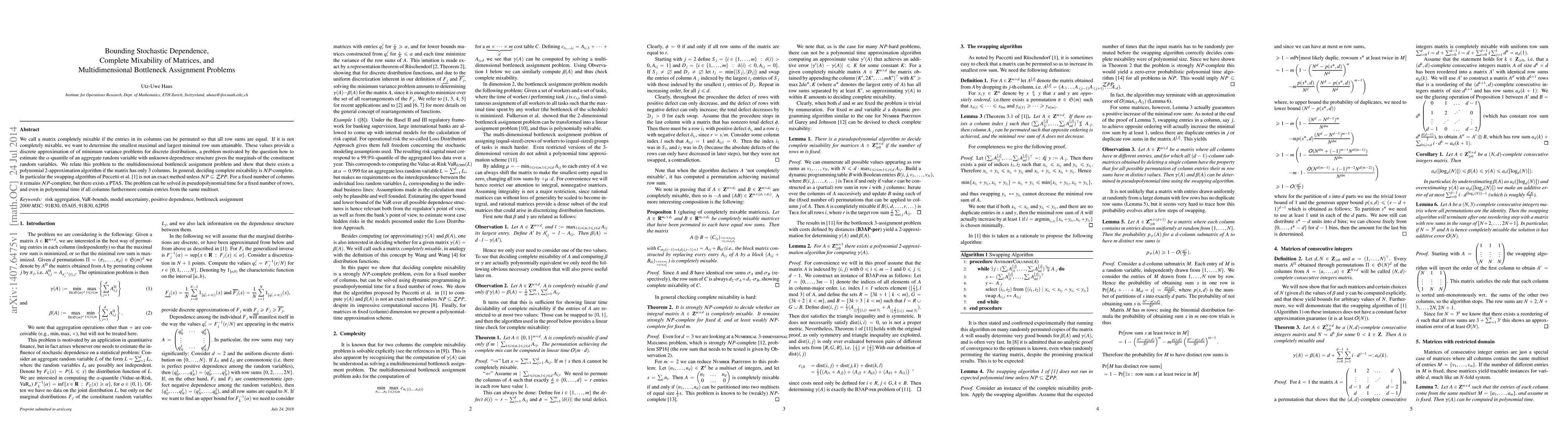 We call a matrix completely mixable if the entries in its columns can be permuted so that all row sums are equal. If it is not completely mixable, we want to determine the smallest maximal and largest minimal row sum attainable. These values provide a discrete approximation of of minimum variance problems for discrete distributions, a problem motivated by the question how to estimate the $\alpha$-quantile of an aggregate random variable with unknown dependence structure given the marginals of the constituent random variables. We relate this problem to the multidimensional bottleneck assignment problem and show that there exists a polynomial $2$-approximation algorithm if the matrix has only $3$ columns. In general, deciding complete mixability is $\mathcal{NP}$-complete. In particular the swapping algorithm of Puccetti et al. is not an exact method unless $\mathcal{NP}\subseteq\mathcal{ZPP}$. For a fixed number of columns it remains $\mathcal{NP}$-complete, but there exists a PTAS. The problem can be solved in pseudopolynomial time for a fixed number of rows, and even in polynomial time if all columns furthermore contain entries from the same multiset.