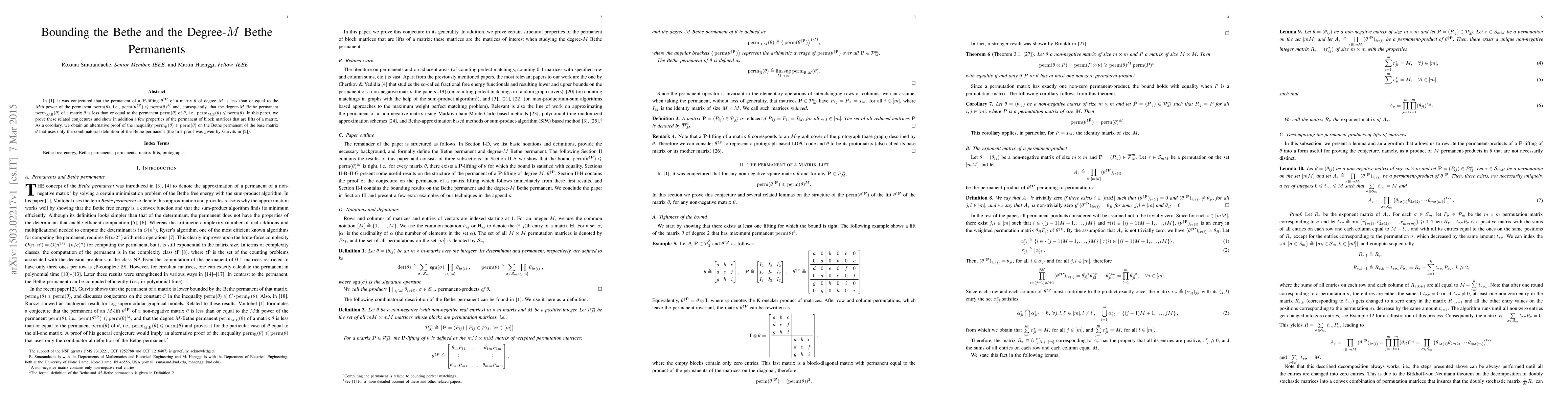 This paper proves the conjectures that the permanent of a $P$-lifting of a matrix $\theta$ is less than or equal to the $M$th power of the permanent of $\theta$ and that the degree-$M$ Bethe permanent is less than or equal to the permanent of $\theta$. It also provides properties of block matrices and an alternative proof for the Bethe permanent inequality.