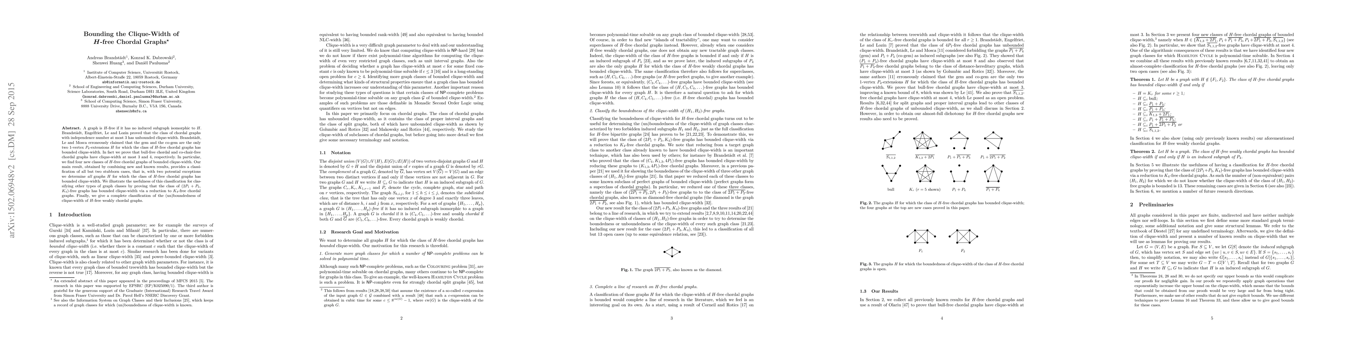 This paper corrects previous claims regarding the clique-width of $H$-free chordal graphs and identifies new classes, specifically showing that bull-free and co-chair-free chordal graphs have bounded clique-width of at most 3 and 4, respectively. The authors classify most $H$-free chordal graphs by their clique-width, with only two potential exceptions, and demonstrate the utility of their findings by showing that $(2P_1+P_3,K_4)$-free graphs also have bounded clique-width.