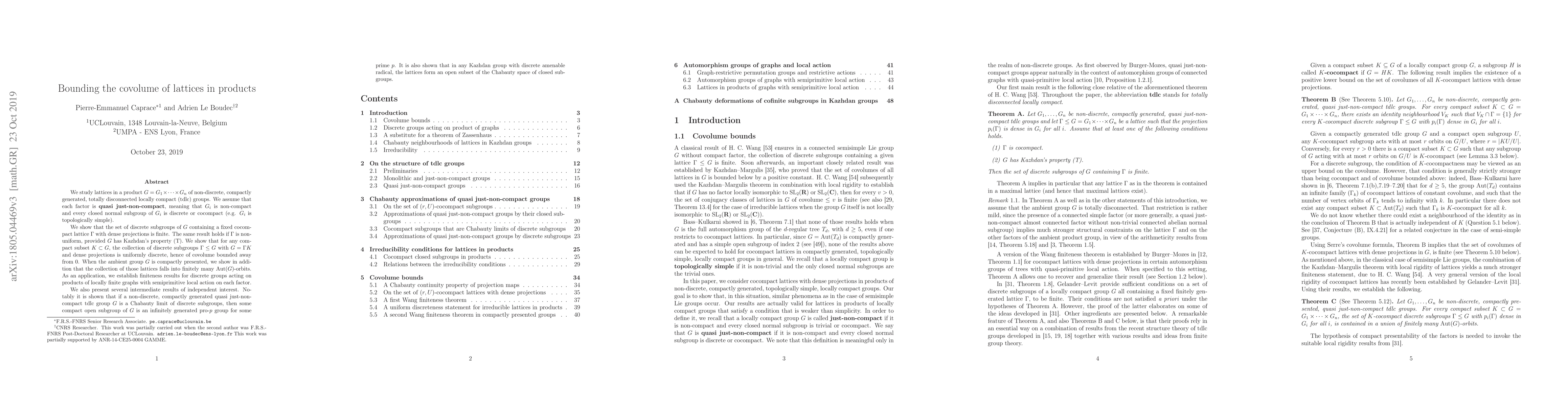 We study lattices in a product $G = G_1 \times \dots \times G_n$ of non-discrete, compactly generated, totally disconnected locally compact (tdlc) groups. We assume that each factor is quasi just-non-compact, meaning that $G_i$ is non-compact and every closed normal subgroup of $G_i$ is discrete or cocompact (e.g. $G_i$ is topologically simple). We show that the set of discrete subgroups of $G$ containing a fixed cocompact lattice $\Gamma$ with dense projections is finite. The same result holds if $\Gamma$ is non-uniform, provided $G$ has Kazhdan's property (T). We show that for any compact subset $K \subset G$, the collection of discrete subgroups $\Gamma \leq G$ with $G = \Gamma K$ and dense projections is uniformly discrete, hence of covolume bounded away from $0$. When the ambient group $G$ is compactly presented, we show in addition that the collection of those lattices falls into finitely many $Aut(G)$-orbits. As an application, we establish finiteness results for discrete groups acting on products of locally finite graphs with semiprimitive local action on each factor. We also present several intermediate results of independent interest. Notably it is shown that if a non-discrete, compactly generated quasi just-non-compact tdlc group $G$ is a Chabauty limit of discrete subgroups, then some compact open subgroup of $G$ is an infinitely generated pro-$p$ group for some prime $p$. It is also shown that in any Kazhdan group with discrete amenable radical, the lattices form an open subset of the Chabauty space of closed subgroups.