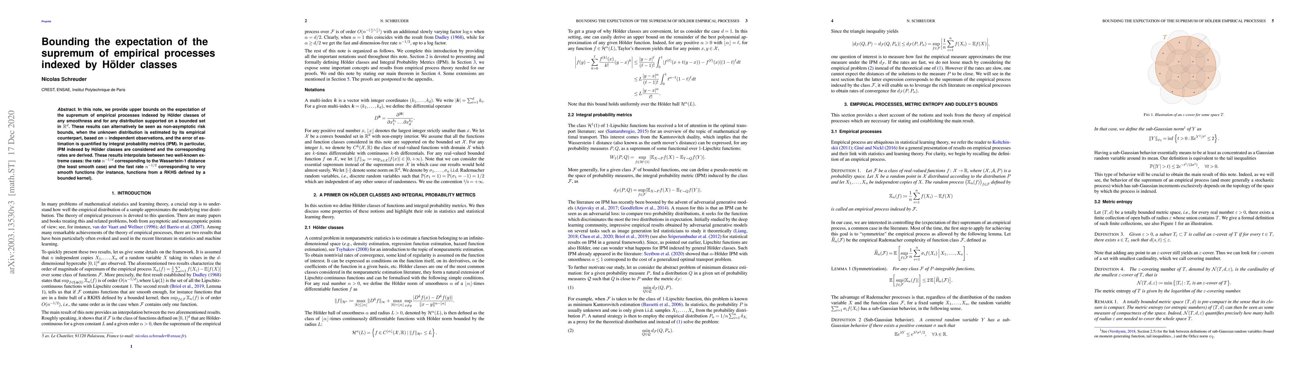 This paper provides upper bounds on the expectation of the supremum of empirical processes indexed by H\"older classes, offering non-asymptotic risk bounds for estimating an unknown distribution using empirical data. The derived rates interpolate between $n^{-1/d}$ and $n^{-1/2}$ based on the smoothness of the H\"older class.