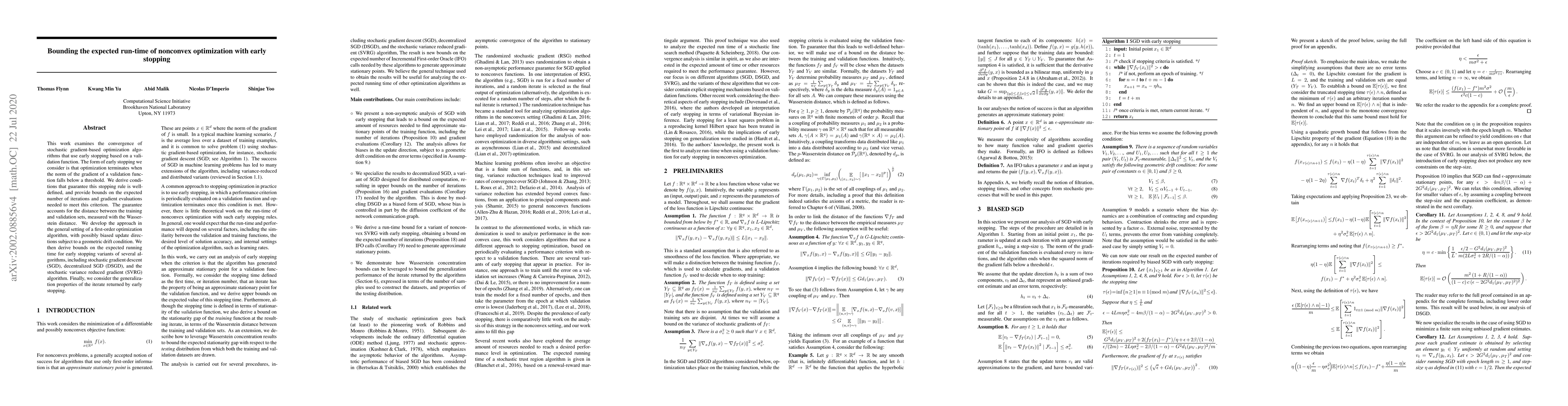 Researchers develop conditions for early stopping in nonconvex optimization, bounding expected run-time using Wasserstein distance between training and validation sets. They apply this to popular algorithms like SGD, DSGD, and SVRG, providing insight into convergence and generalization properties.