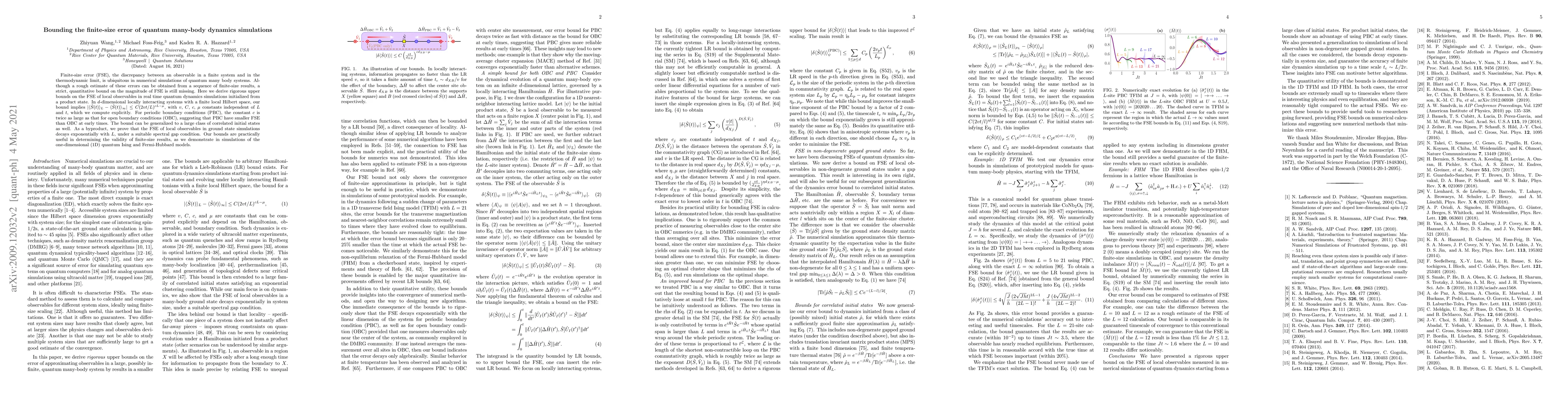 This paper derives rigorous upper bounds for finite-size error in quantum many-body dynamics simulations, providing a quantitative measure of discrepancies between finite and infinite systems. The derived bounds show that periodic boundary conditions yield smaller errors than open boundary conditions at early times, and they are demonstrated to be useful in validating results for the 1D quantum Ising and Fermi-Hubbard models.