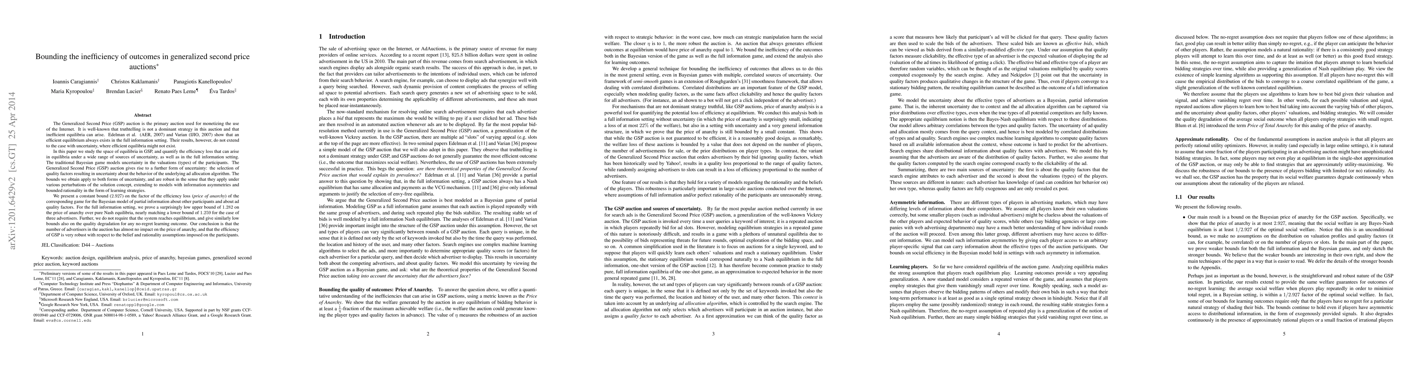 The Generalized Second Price (GSP) auction is the primary auction used for monetizing the use of the Internet. It is well-known that truthtelling is not a dominant strategy in this auction and that inefficient equilibria can arise. In this paper we study the space of equilibria in GSP, and quantify the efficiency loss that can arise in equilibria under a wide range of sources of uncertainty, as well as in the full information setting. The traditional Bayesian game models uncertainty in the valuations (types) of the participants. The Generalized Second Price (GSP) auction gives rise to a further form of uncertainty: the selection of quality factors resulting in uncertainty about the behavior of the underlying ad allocation algorithm. The bounds we obtain apply to both forms of uncertainty, and are robust in the sense that they apply under various perturbations of the solution concept, extending to models with information asymmetries and bounded rationality in the form of learning strategies. We present a constant bound (2.927) on the factor of the efficiency loss (\emph{price of anarchy}) of the corresponding game for the Bayesian model of partial information about other participants and about ad quality factors. For the full information setting, we prove a surprisingly low upper bound of 1.282 on the price of anarchy over pure Nash equilibria, nearly matching a lower bound of 1.259 for the case of three advertisers. Further, we do not require that the system reaches equilibrium, and give similarly low bounds also on the quality degradation for any no-regret learning outcome. Our conclusion is that the number of advertisers in the auction has almost no impact on the price of anarchy, and that the efficiency of GSP is very robust with respect to the belief and rationality assumptions imposed on the participants.