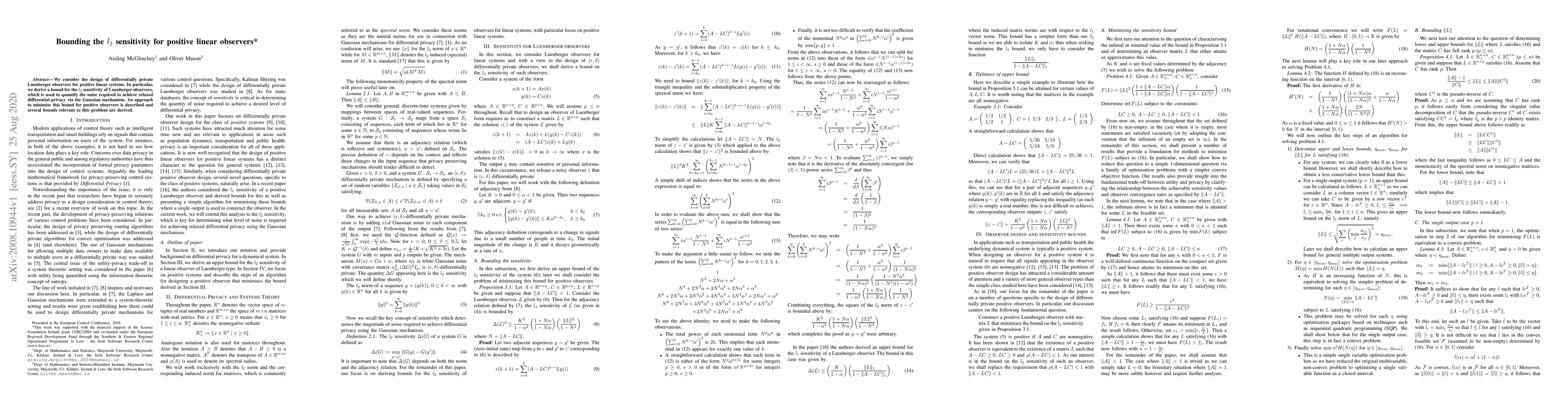We consider the design of differentially private Luenberger observers for positive linear systems. In particular, we derive a bound for the $l_2$ sensitivity of Luenberger observers, which is used to quantify the noise required to achieve relaxed differential privacy via the Gaussian mechanism. An approach to minimise this bound for positive observers is described and several bounds relevant to this problem are derived.