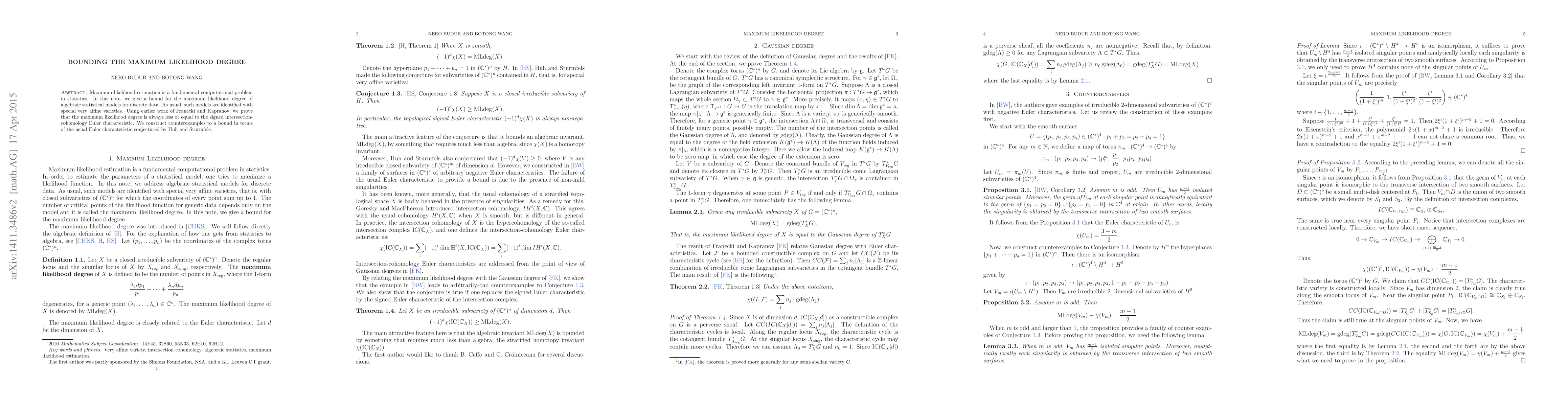 The paper provides a bound for the maximum likelihood degree of algebraic statistical models for discrete data using earlier work of Franecki and Kapranov, relating it to the signed intersection-cohomology Euler characteristic.