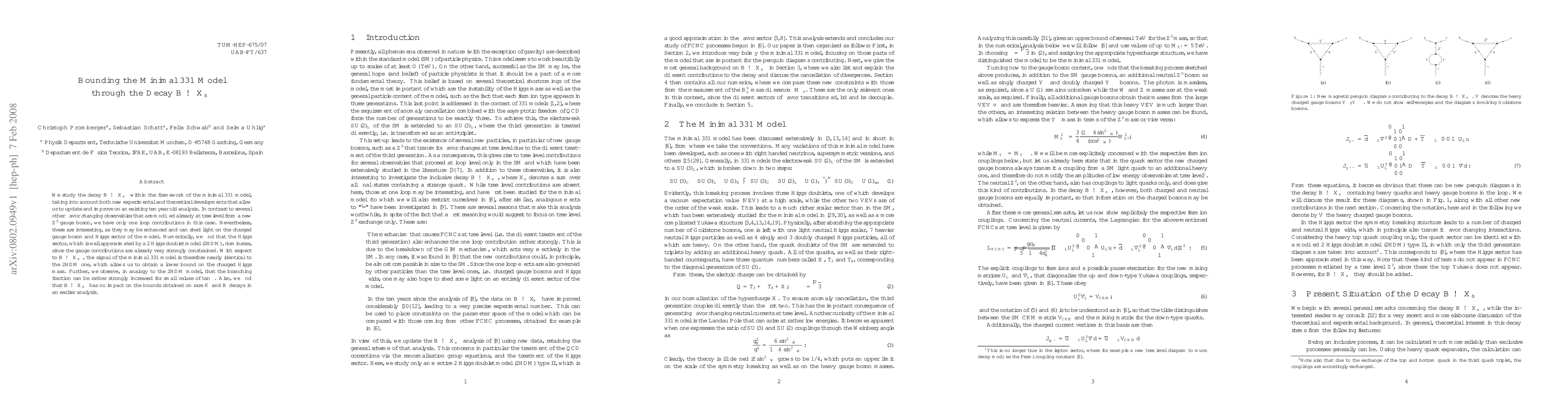 We study the decay B -> X_s gamma within the framework of the minimal 331 model, taking into account both new experimental and theoretical developments that allow us to update and improve on an existing ten year old analysis. In contrast to several other flavor changing observables that are modified already at tree level from a new Z' gauge boson, we have only one loop contributions in this case. Nevertheless, these are interesting, as they may be enhanced and can shed light on the charged gauge boson and Higgs sector of the model. Numerically, we find that the Higgs sector, which is well approximated by a 2 Higgs doublet model (2HDM), dominates, since the gauge contributions are already very strongly constrained. With respect to B -> X_s gamma, the signal of the minimal 331 model is therefore nearly identical to the 2HDM one, which allows us to obtain a lower bound on the charged Higgs mass. Further, we observe, in analogy to the 2HDM model, that the branching fraction can be rather strongly increased for small values of tan beta. Also, we find that B -> X_s gamma has no impact on the bounds obtained on rare K and B decays in an earlier analysis.