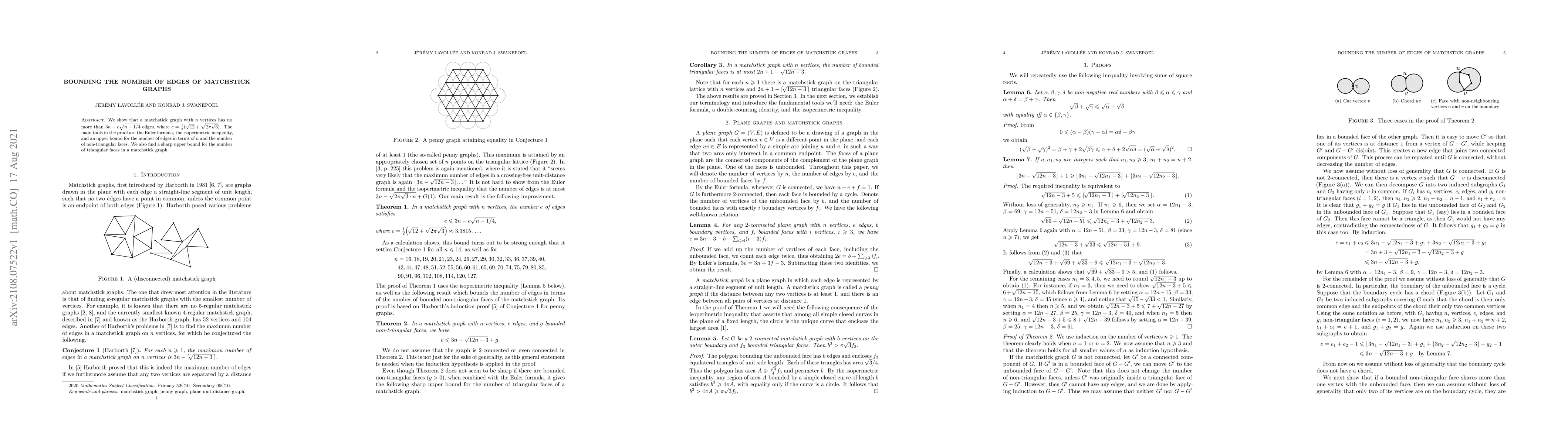We show that a matchstick graph with $n$ vertices has no more than $3n-c\sqrt{n-1/4}$ edges, where $c=\frac12(\sqrt{12} + \sqrt{2\pi\sqrt{3}})$. The main tools in the proof are the Euler formula, the isoperimetric inequality, and an upper bound for the number of edges in terms of $n$ and the number of non-triangular faces. We also find a sharp upper bound for the number of triangular faces in a matchstick graph.