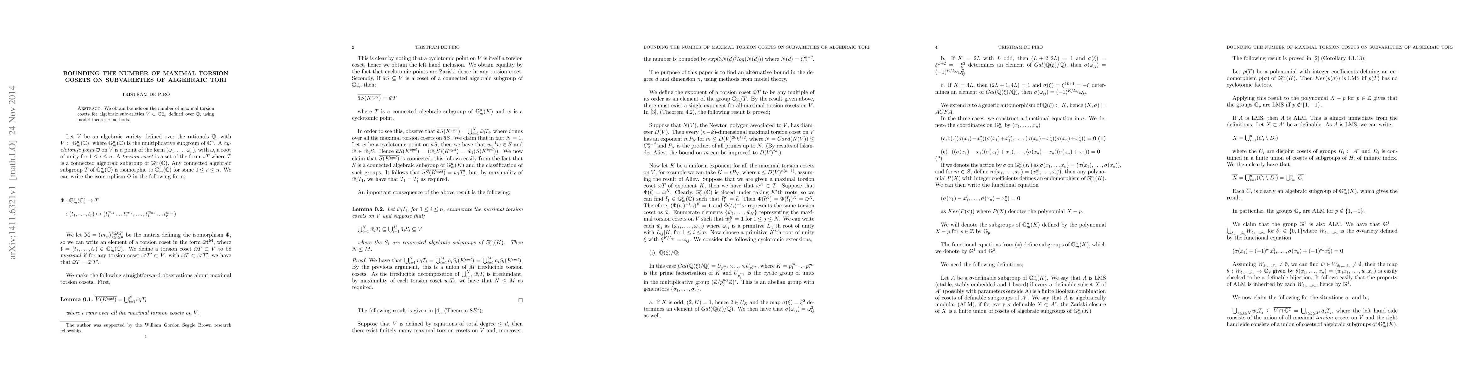 Summary: This paper provides bounds on the number of maximal torsion cosets for algebraic subvarieties of n-tori over the rationals, employing model theoretic techniques to achieve these results.