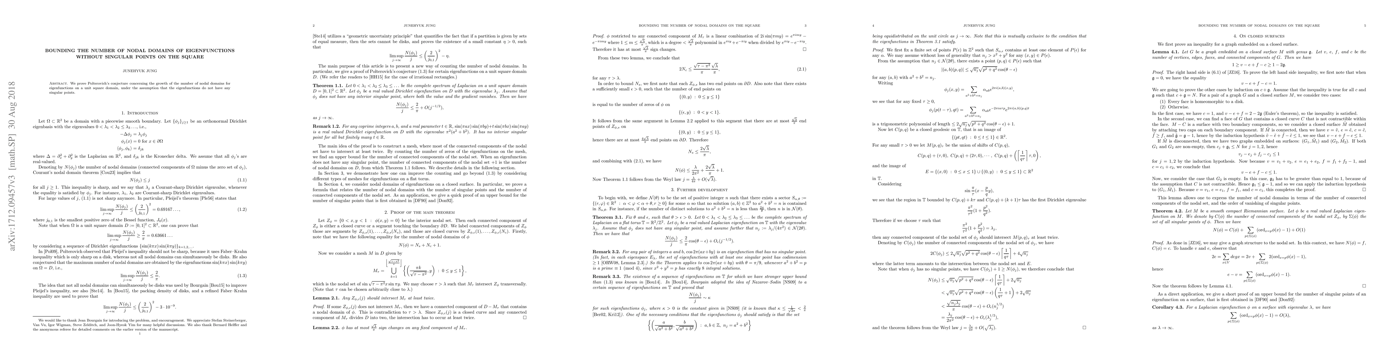 Summary: This paper proves Polterovich's conjecture on the growth of the number of nodal domains for eigenfunctions on a unit square, provided that these eigenfunctions lack singular points. The result establishes a bound on the number of such domains.