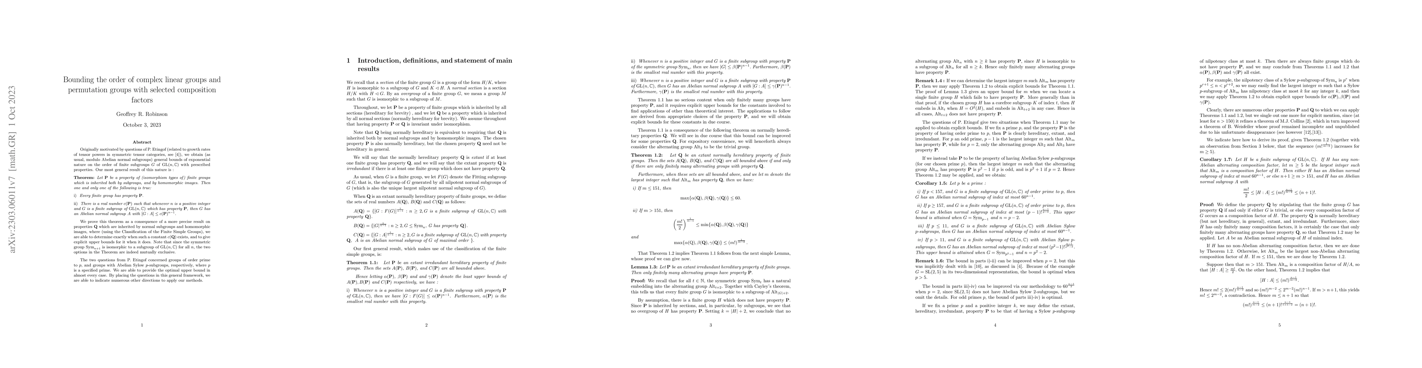 Originally motivated by questions of P. Etingof related to growth rates of tensor powers in symmetric tensor categories, we obtain general bounds on the order of finite subgroups of ${\rm GL}(n,\mathbb{C})$ with restricted composition factors (as usual, modulo Abelian normal subgroups). We place the question in a wider context, and find other applications.