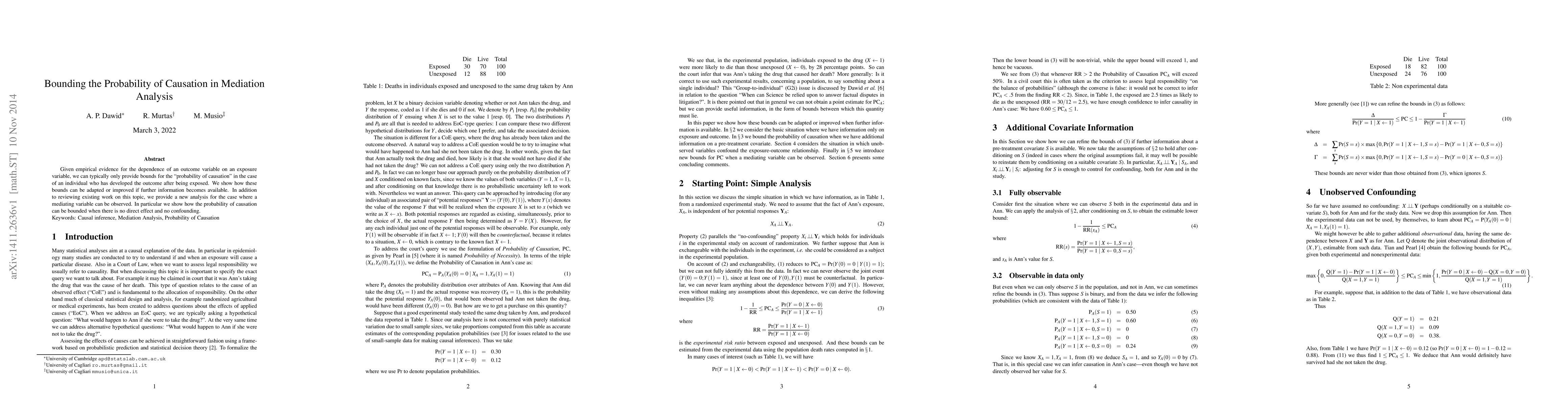 This paper explores methods to bound the "probability of causation" in mediation analysis, especially when a mediating variable is observed. It improves existing bounds by incorporating new information and examines scenarios with no direct effect and no confounding.