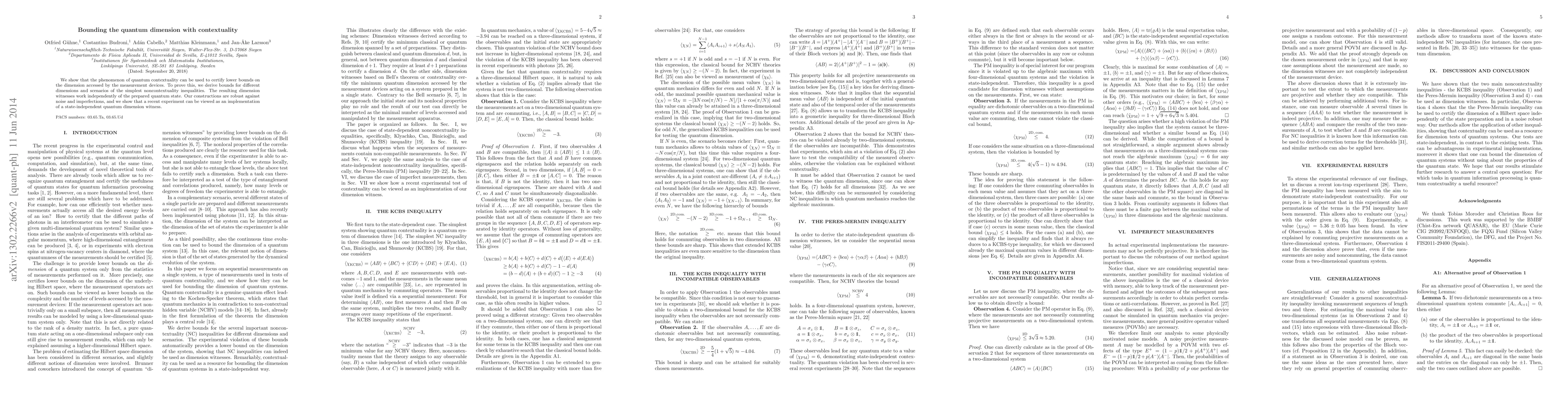 This paper demonstrates that quantum contextuality can certify lower bounds on the dimension accessed by measurement devices, deriving robust dimension witnesses that work regardless of the quantum state prepared and are resilient to noise and imperfections. An experiment is highlighted as an implementation of a state-independent quantum dimension witness.
