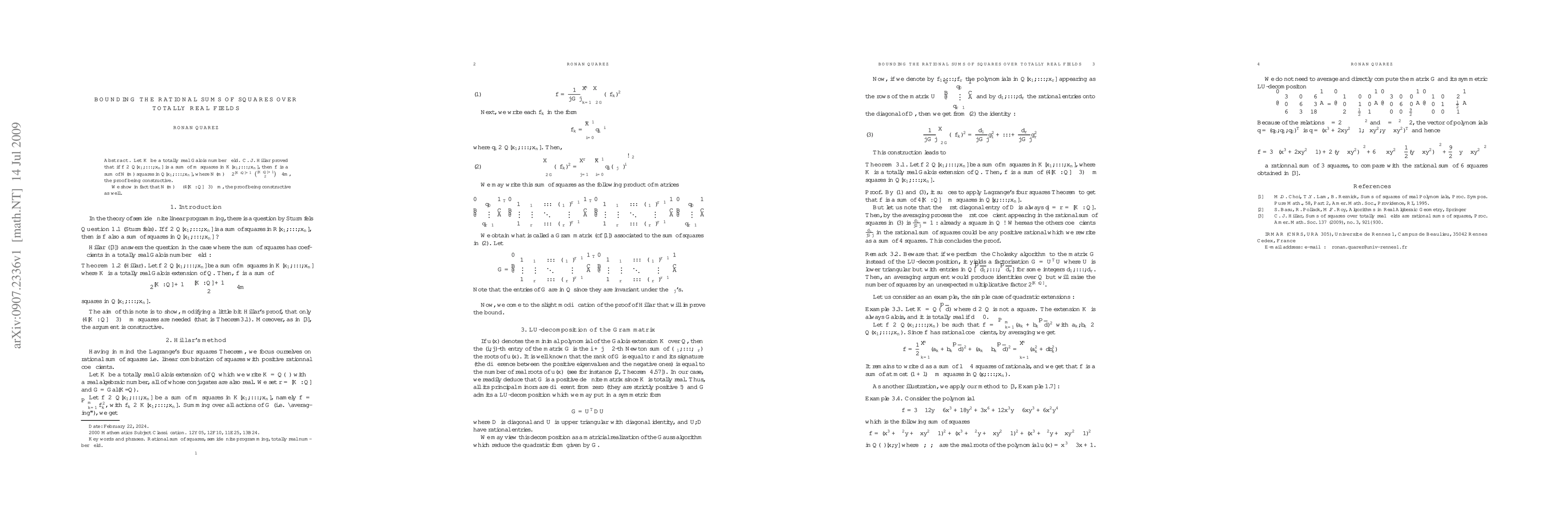 Let K be a totally real Galois number field. C. J. Hillar proved that if f in Q[x_1,...,x_n] is a sum of m squares in K[x_1,...,x_n], then f is a sum of N(m) squares in Q[x_1,...,x_n]. Modifying Hillar's proof, we improve the improve the bound given for N(m), the proof being constructive as well.