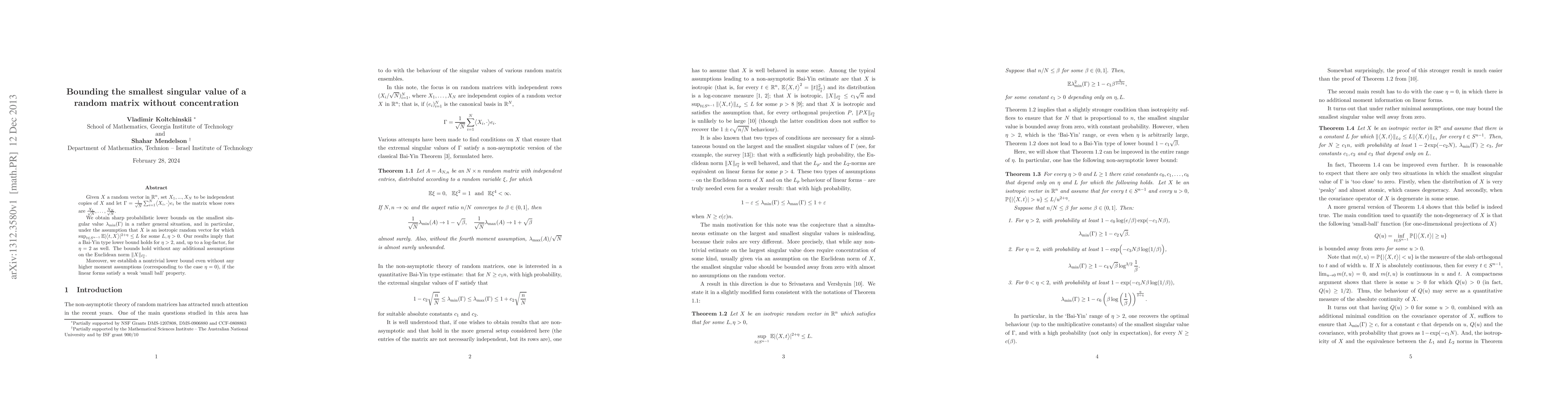 This research paper establishes probabilistic lower bounds on the smallest singular value of a random matrix without concentration assumptions, improving upon existing results for isotropic random vectors with certain moment constraints.