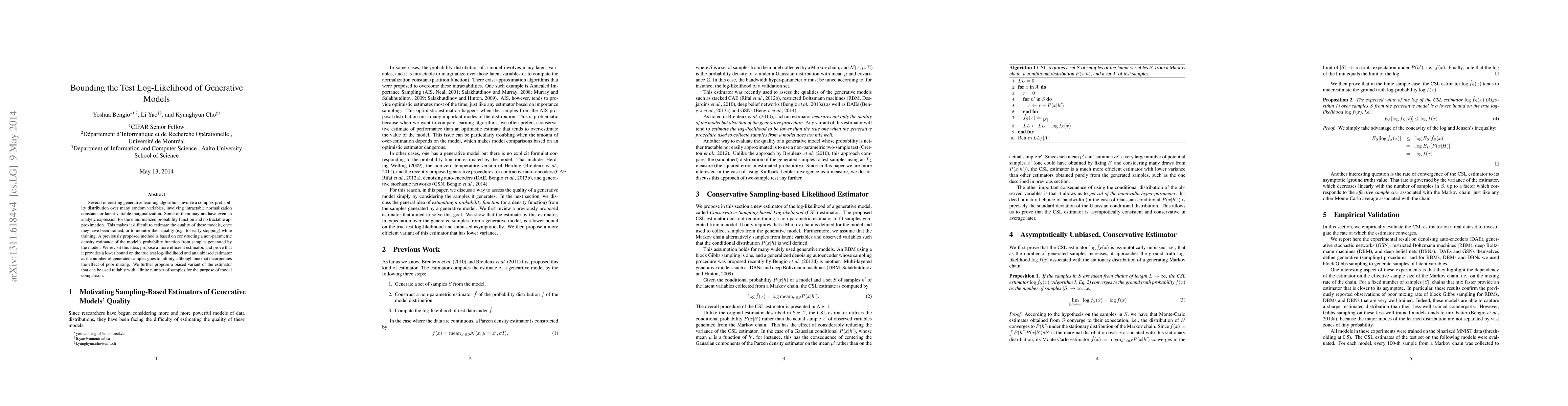 Several interesting generative learning algorithms involve a complex probability distribution over many random variables, involving intractable normalization constants or latent variable normalization. Some of them may even not have an analytic expression for the unnormalized probability function and no tractable approximation. This makes it difficult to estimate the quality of these models, once they have been trained, or to monitor their quality (e.g. for early stopping) while training. A previously proposed method is based on constructing a non-parametric density estimator of the model's probability function from samples generated by the model. We revisit this idea, propose a more efficient estimator, and prove that it provides a lower bound on the true test log-likelihood, and an unbiased estimator as the number of generated samples goes to infinity, although one that incorporates the effect of poor mixing. We further propose a biased variant of the estimator that can be used reliably with a finite number of samples for the purpose of model comparison.