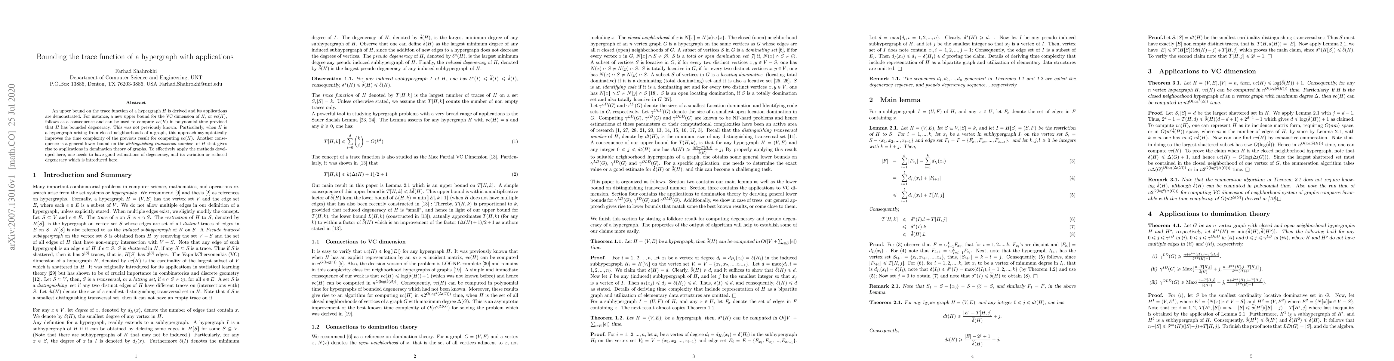 An upper bound on the trace function of a hypergraph $H$ is derived and its applications are demonstrated. For instance, a new upper bound for the VC dimension of $H$, or $vc(H)$, follows as a consequence and can be used to compute $vc(H)$ in polynomial time provided that $H$ has bounded degeneracy. This was not previously known. Particularly, when $H$ is a hypergraph arising from closed neighborhoods of a graph, this approach asymptotically improves the time complexity of the previous result for computing $vc(H)$. Another consequence is a general lower bound on the {\it distinguishing transversal number } of $H$ that gives rise to applications in domination theory of graphs. To effectively apply the methods developed here, one needs to have good estimations of degeneracy, and its variation or reduced degeneracy which is introduced here.