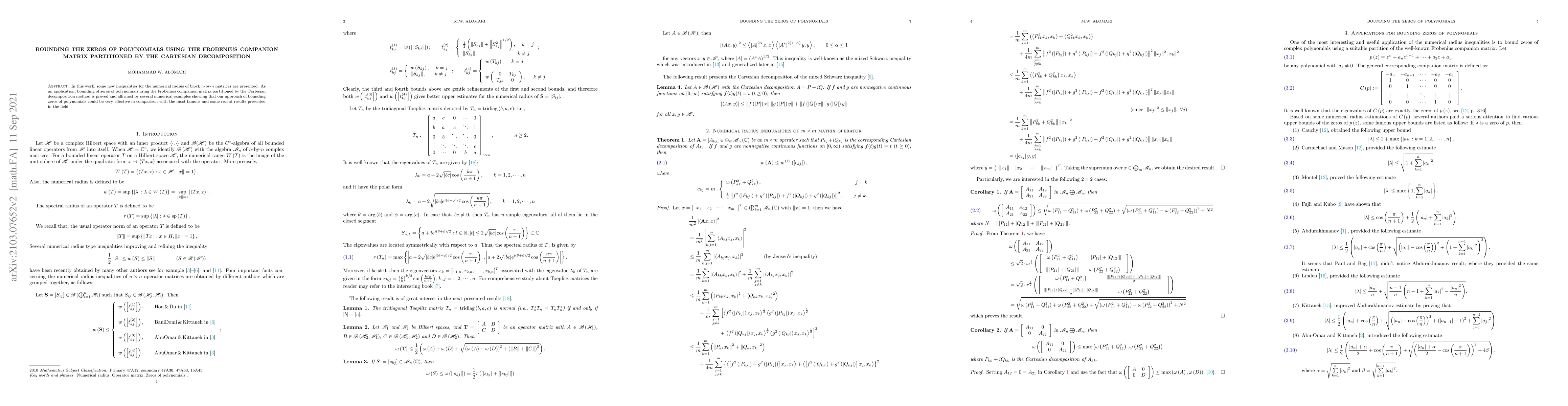 This paper presents new inequalities for the numerical radius of block matrices, applying these to effectively bound the zeros of polynomials using the Frobenius companion matrix partitioned via Cartesian decomposition, demonstrating superior performance compared to existing methods through a numerical example.