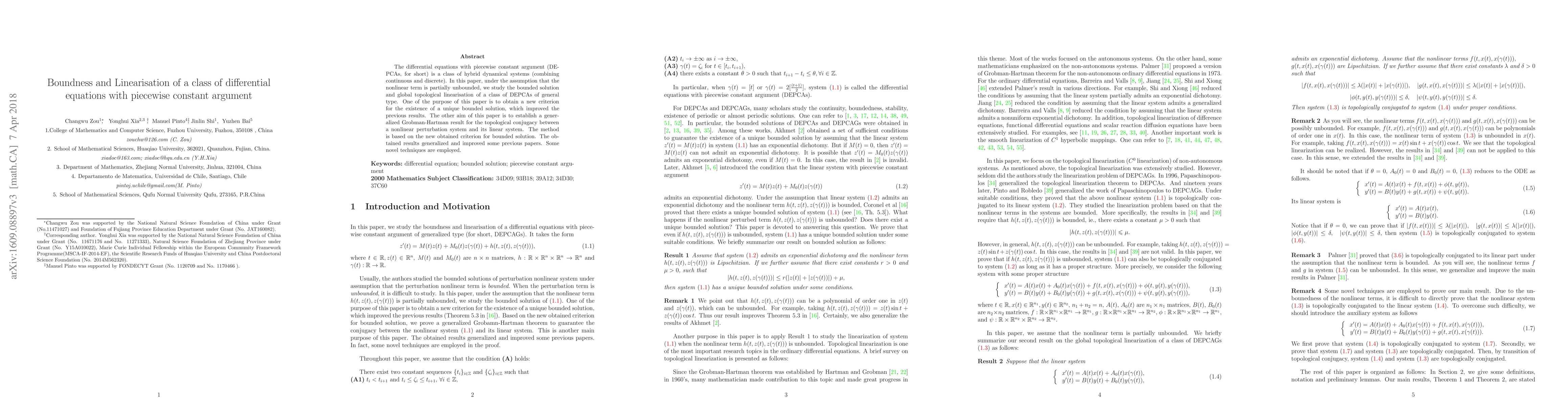 The differential equations with piecewise constant argument (DEPCAs, for short) is a class of hybrid dynamical systems (combining continuous and discrete). In this paper, under the assumption that the nonlinear term is partially unbounded, we study the bounded solution and global topological linearisation of a class of DEPCAs of general type. One of the purpose of this paper is to obtain a new criterion for the existence of a unique bounded solution, which improved the previous results. The other aim of this paper is to establish a generalized Grobman-Hartman-type theorem for the topological conjugacy between a nonlinear perturbation system and its linear system. The method is based on the new obtained criterion for bounded solution. The obtained results generalized and improved some previous papers. Some novel techniques are employed.
