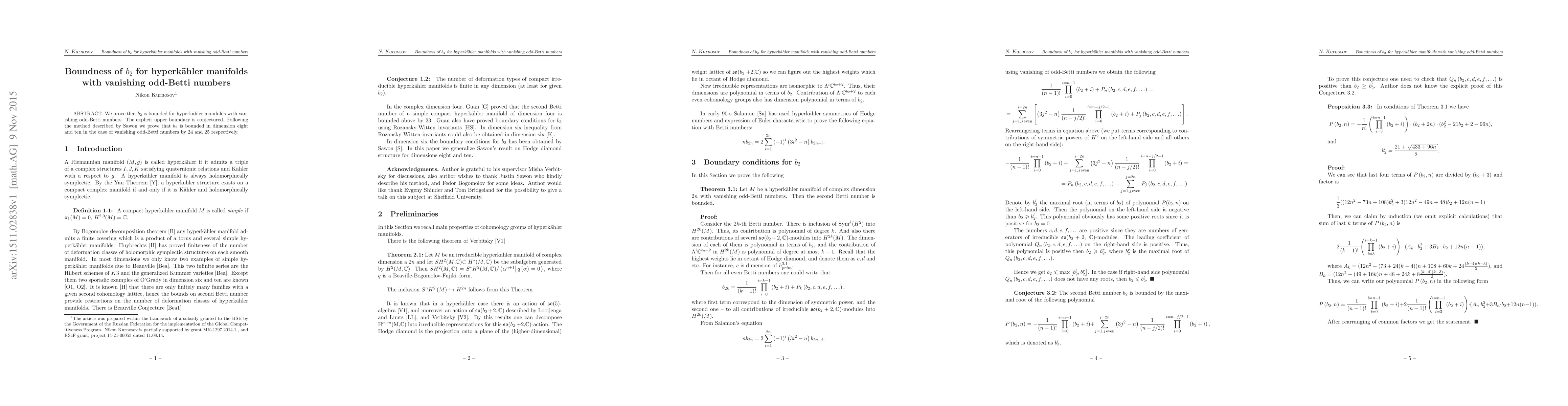 This paper demonstrates that the second Betti number $b_2$ is bounded for hyperkähler manifolds where all odd-Betti numbers are zero. It specifically proves an upper limit of 24 for dimension eight and 25 for dimension ten, following the method outlined by Sawon.