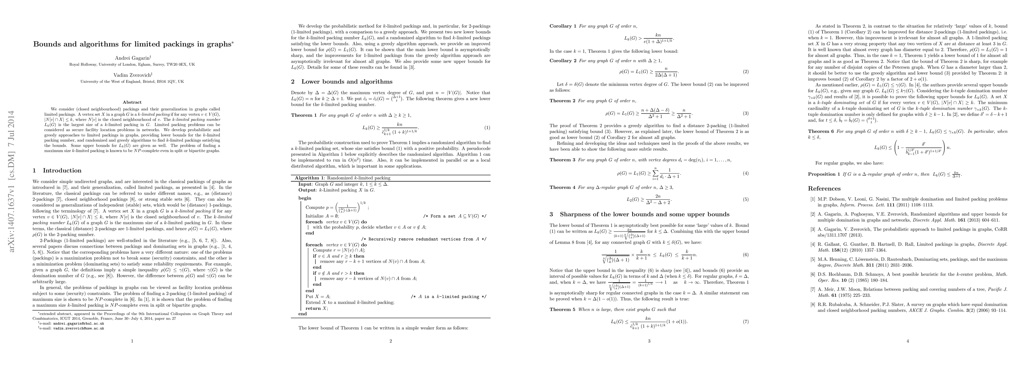 This paper explores k-limited packings in graphs, where a vertex set satisfies a neighborhood constraint. It develops probabilistic and greedy algorithms to find such packings, provides lower and upper bounds for the k-limited packing number, and confirms the NP-completeness of the maximum size k-limited packing problem.