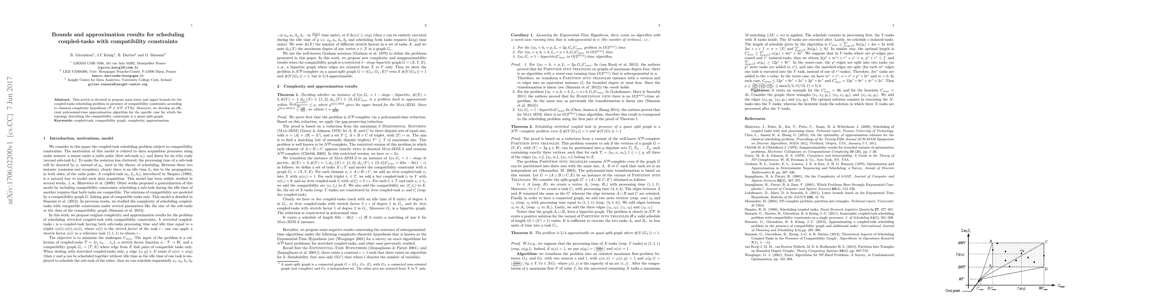 This article is devoted to propose some lower and upper bounds for the coupled-tasks scheduling problem in presence of compatibility constraints according to classical complexity hypothesis ($\mathcal{P} \neq \mathcal{NP}$, $\mathcal{ETH}$). Moreover, we develop an efficient polynomial-time approximation algorithm for the specific case for which the topology describing the compatibility constraints is a quasi split-graph.