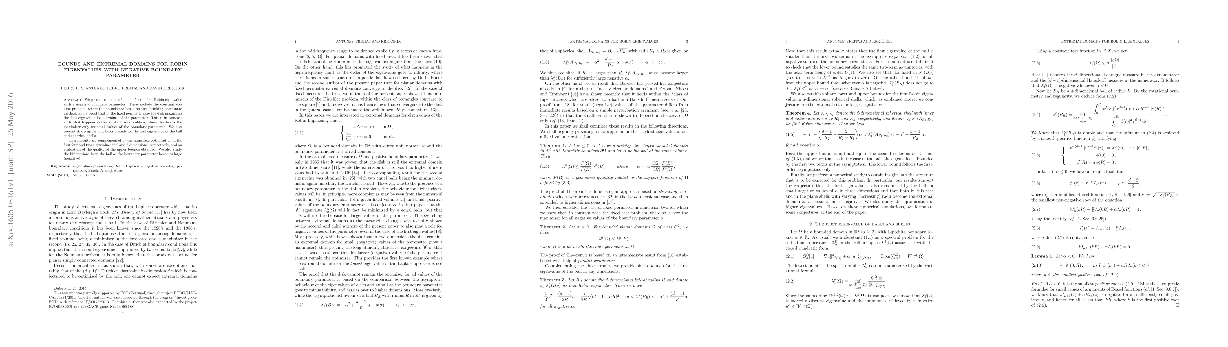 This paper presents new bounds for the first Robin eigenvalue with a negative boundary parameter, showing that the disk maximizes the first eigenvalue in the fixed perimeter case for all parameter values, unlike the constant area case. It also provides sharp bounds for the ball and spherical shells, and includes numerical optimization and bifurcation analysis.