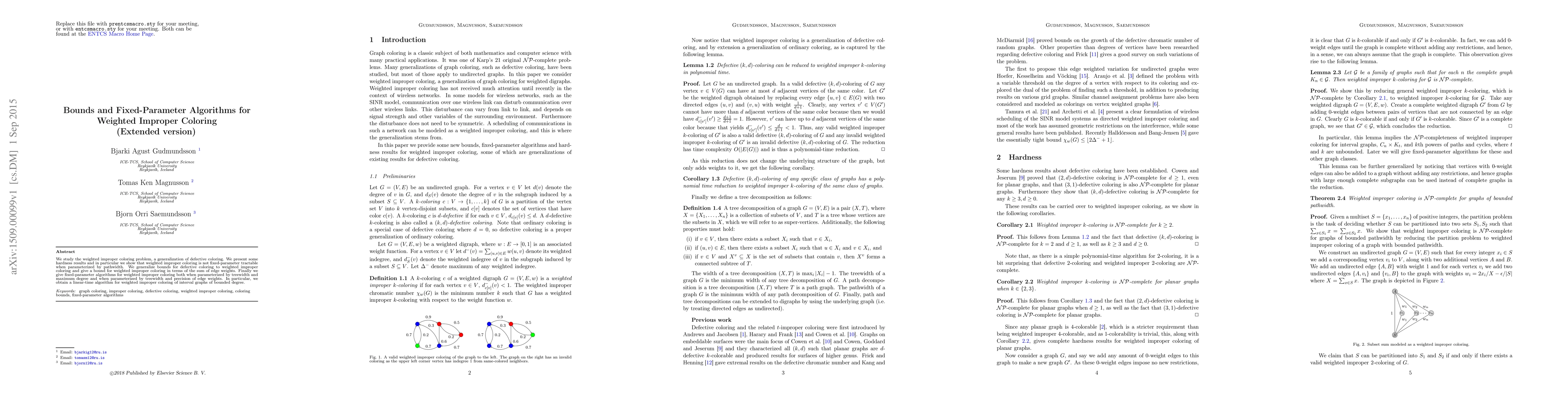 This paper investigates the weighted improper coloring problem, demonstrating its computational complexity and presenting fixed-parameter algorithms for specific parameters. It shows the problem is not fixed-parameter tractable by pathwidth and provides algorithms parameterized by treewidth, maximum degree, and precision of edge weights, including a linear-time solution for interval graphs of bounded degree.