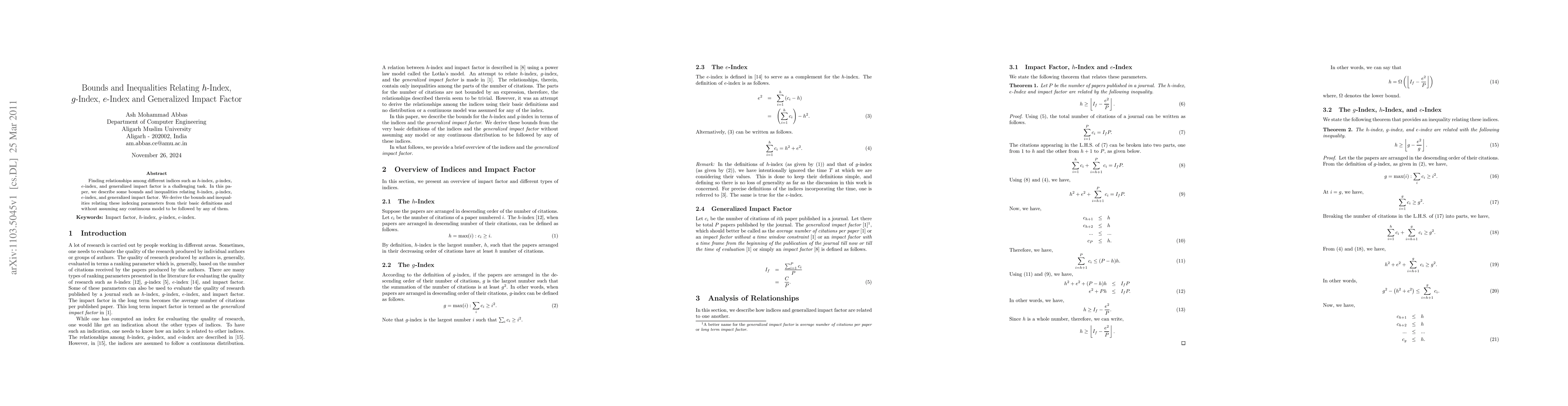 Finding relationships among different indices such as h-index, g-index, e-index, and generalized impact factor is a challenging task. In this paper, we describe some bounds and inequalities relating h-index, g-index, e-index, and generalized impact factor. We derive the bounds and inequalities relating these indexing parameters from their basic definitions and without assuming any continuous model to be followed by any of them.
