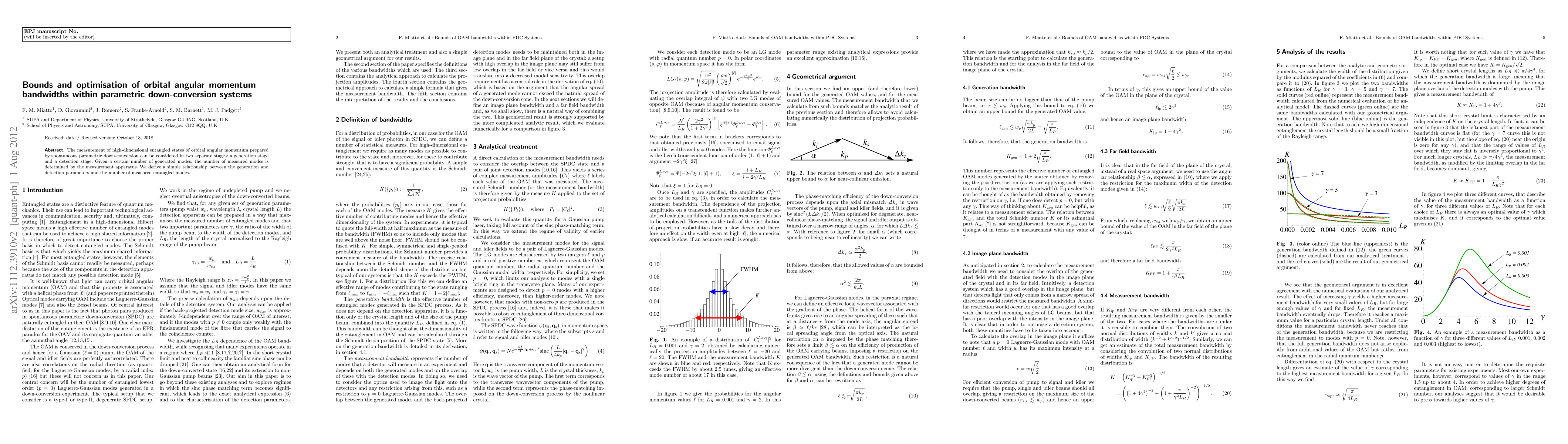 This paper investigates the generation and detection of high-dimensional entangled states of orbital angular momentum via parametric down-conversion, establishing a relationship between generation parameters and the number of measurable entangled modes. The study aims to optimize the bandwidth of these modes for improved measurement efficiency.
