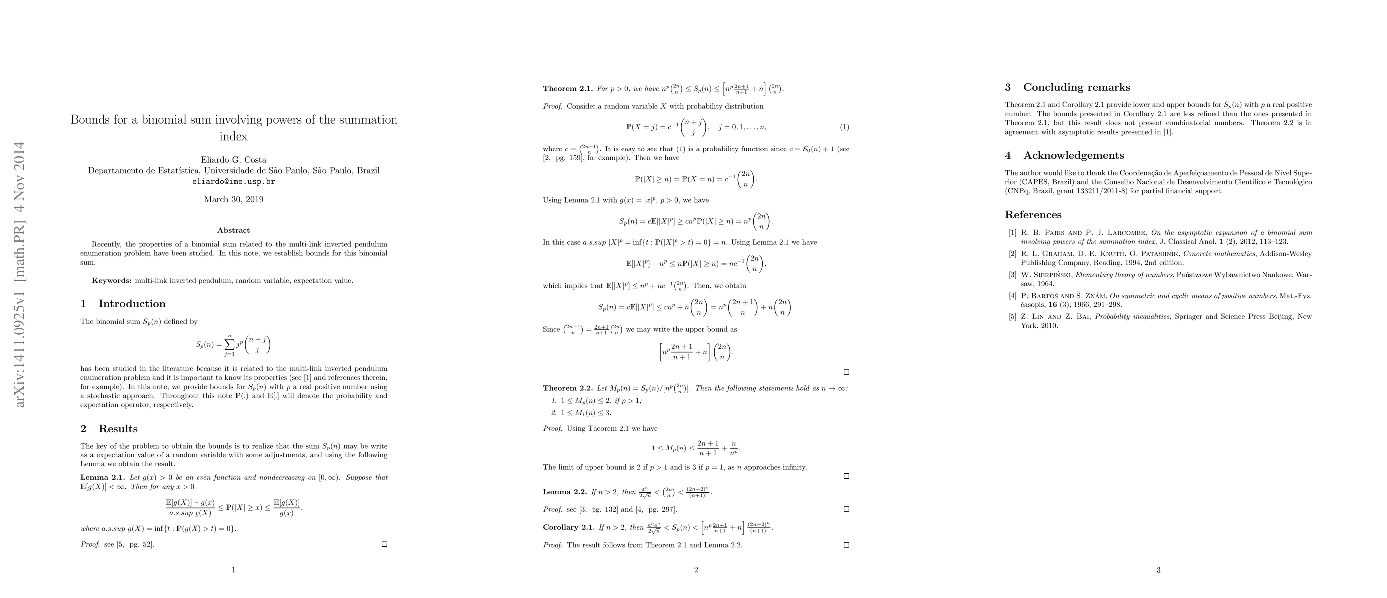 This research is important for understanding the properties of the binomial sum Sp(n) related to the multi-link inverted pendulum enumeration problem, which has applications in various fields such as physics and engineering.