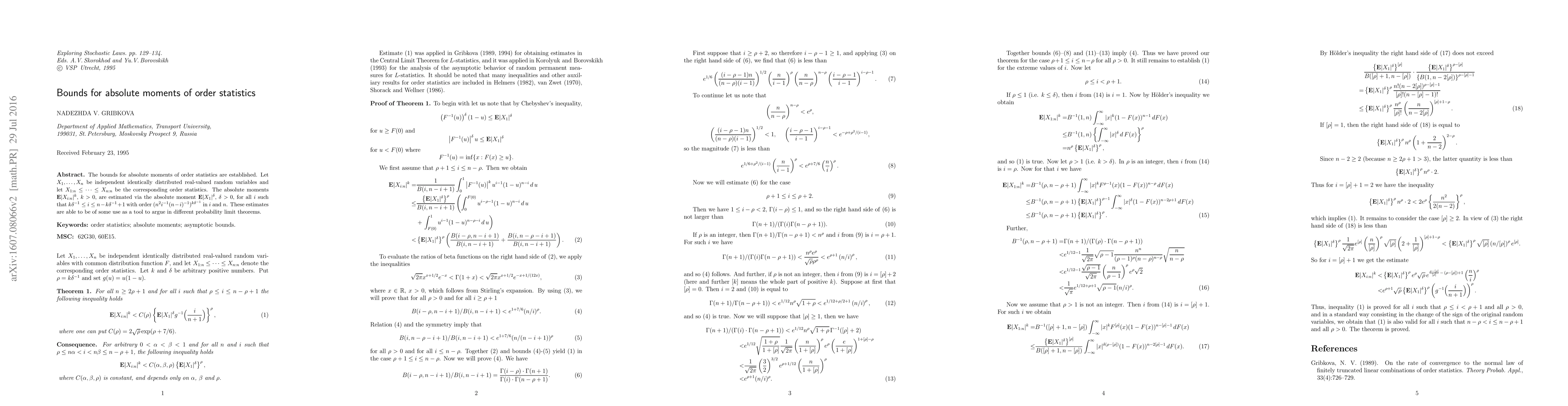 This paper establishes bounds for the absolute moments of order statistics from a set of independent identically distributed random variables. It provides estimates for $\textbf{E}|X_{i:n}|^k$ using $\textbf{E}|X_1|^{\delta}$ and shows these bounds are of order $(n^2i^{-1}(n-i)^{-1})^{k\delta^{-1}}$, useful for various probability limit theorems.
