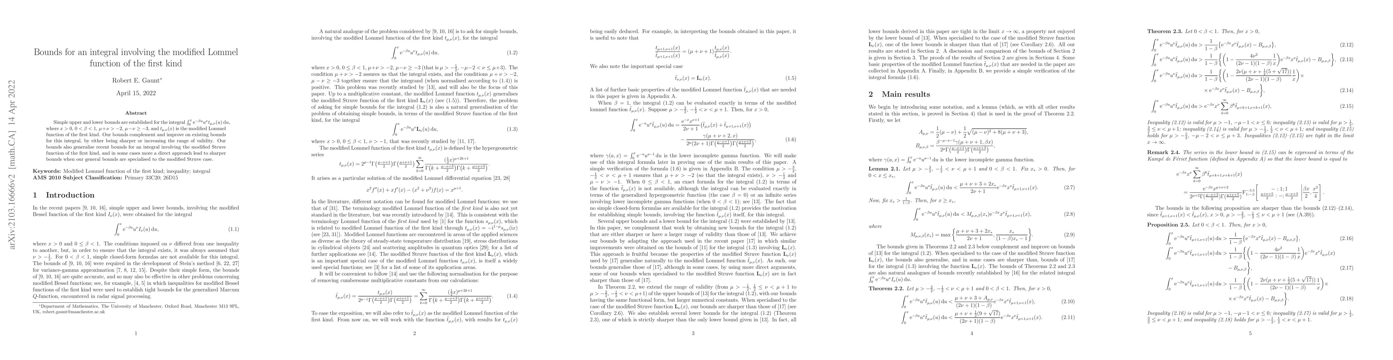 Simple upper and lower bounds are established for the integral $\int_0^x\mathrm{e}^{-\beta u}u^\nu t_{\mu,\nu}(u)\,\mathrm{d}u$, where $x>0$, $0<\beta<1$, $\mu+\nu>-2$, $\mu-\nu\geq-3$, and $t_{\mu,\nu}(x)$ is the modified Lommel function of the first kind. Our bounds complement and improve on existing bounds for this integral, by either being sharper or increasing the range of validity. Our bounds also generalise recent bounds for an integral involving the modified Struve function of the first kind, and in some cases more a direct approach lead to sharper bounds when our general bounds are specialised to the modified Struve case.
