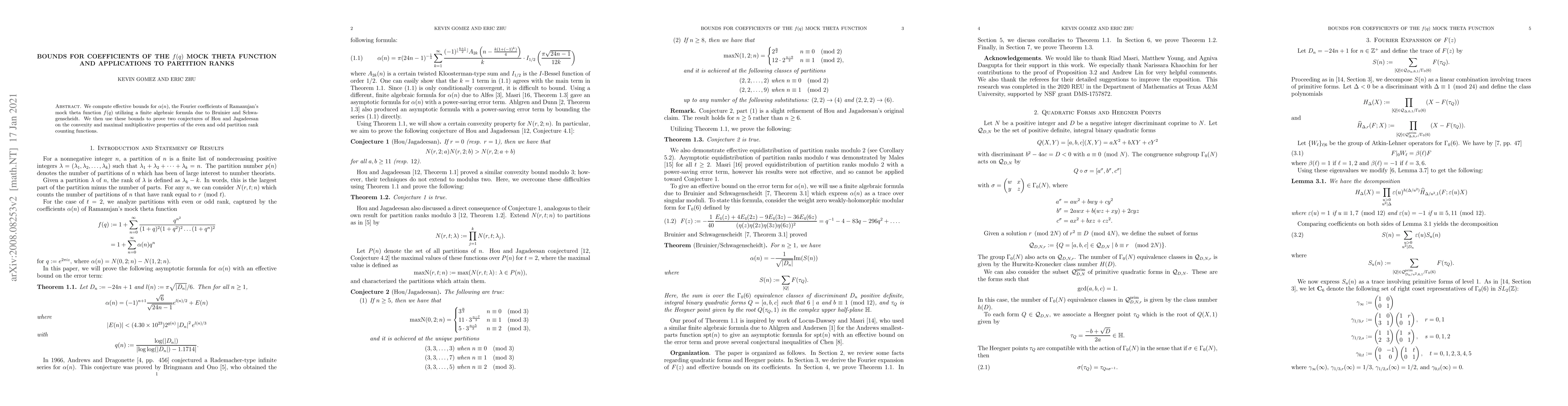 Researchers found bounds for coefficients of Ramunujan's mock theta function, which helps prove conjectures on partition ranks, using a finite algebraic formula.