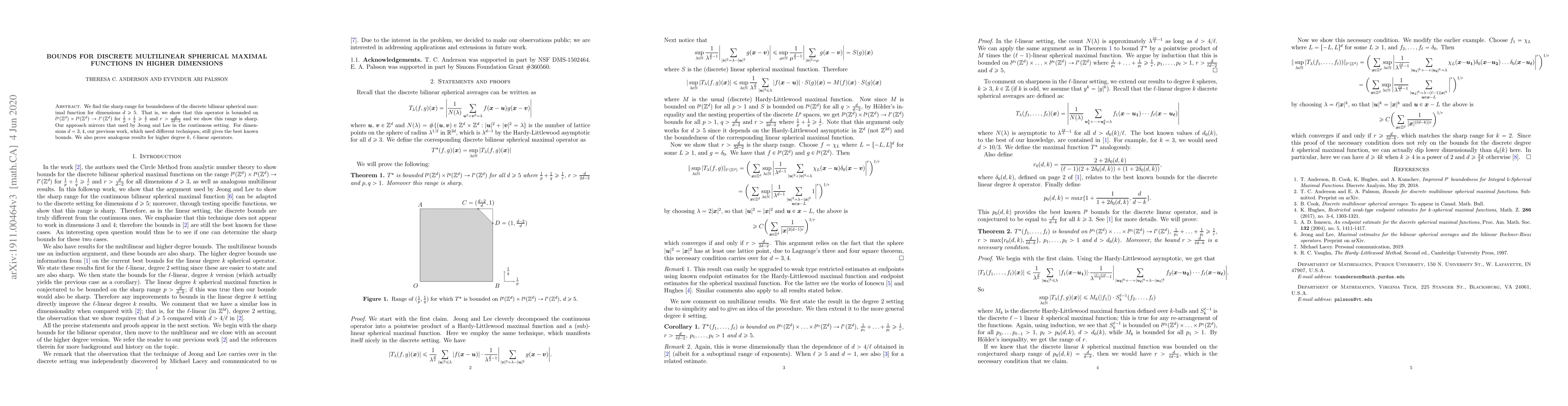 This paper determines the optimal range for the discrete bilinear spherical maximal function's boundedness in dimensions d ≥ 5, showing it's bounded for 1/p + 1/q ≥ 1/r and r > d/(2d-2). The methodology mirrors that used in the continuous setting. For dimensions d=3,4, previous work provides the best known bounds. The research also extends to higher degree k, ℓ-linear operators.