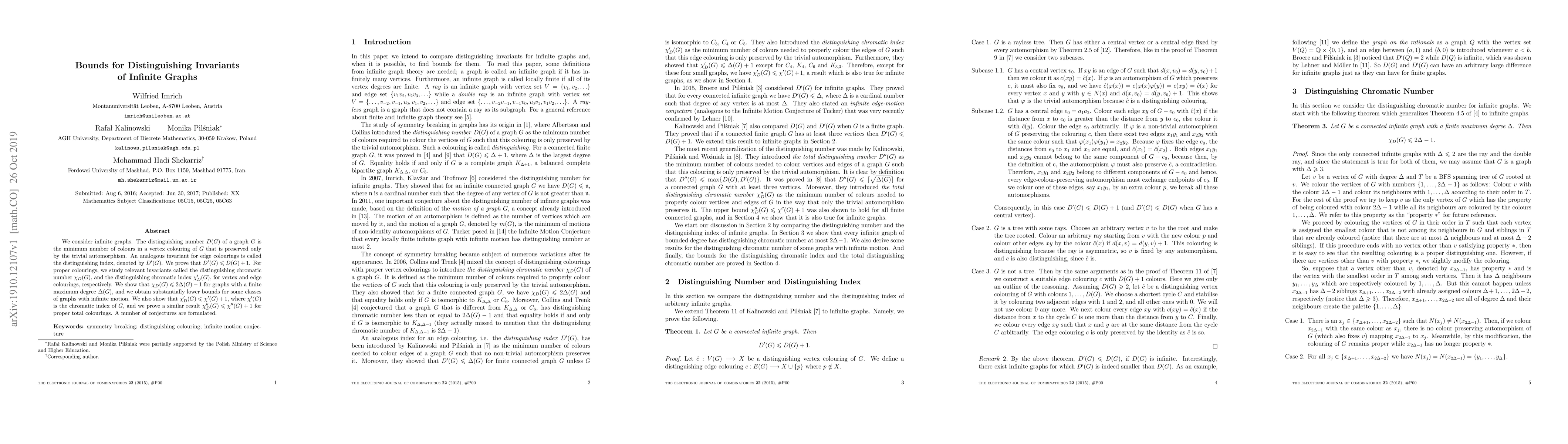 This paper investigates distinguishing invariants for infinite graphs, including the distinguishing number $D(G)$ and the distinguishing index $D'(G)$. It proves that $D'(G) \leq D(G) + 1$ and provides bounds for distinguishing chromatic numbers $\chi_D(G)$ and $\chi'_D(G)$ for vertex and edge colourings, respectively.