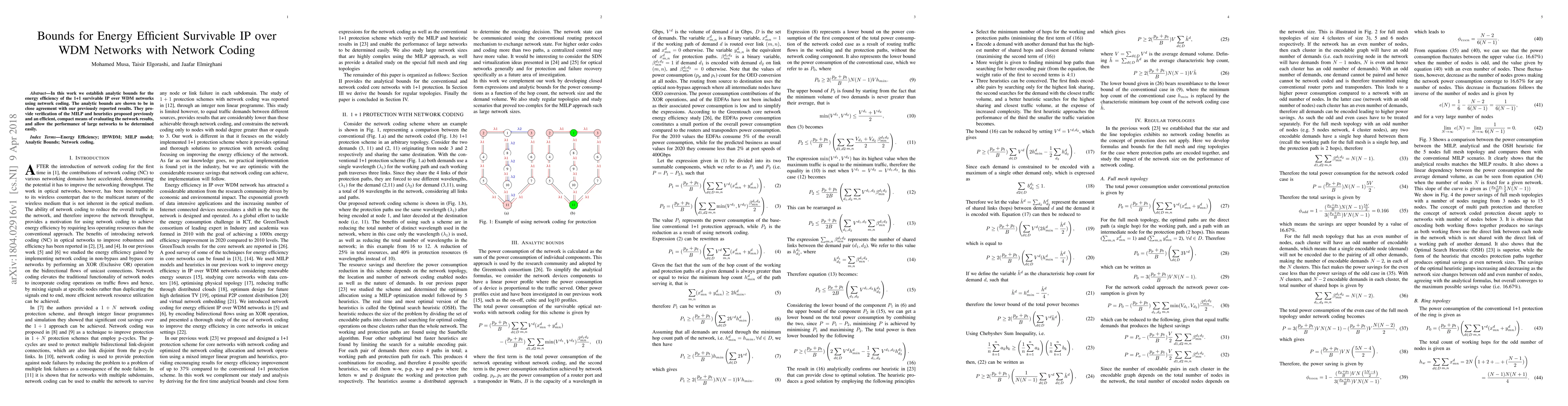 This paper presents analytic bounds for energy-efficient 1 + 1 survivable IP over WDM networks utilizing network coding, verifying previous MILP and heuristic results, and offering a compact method for evaluating network performance.