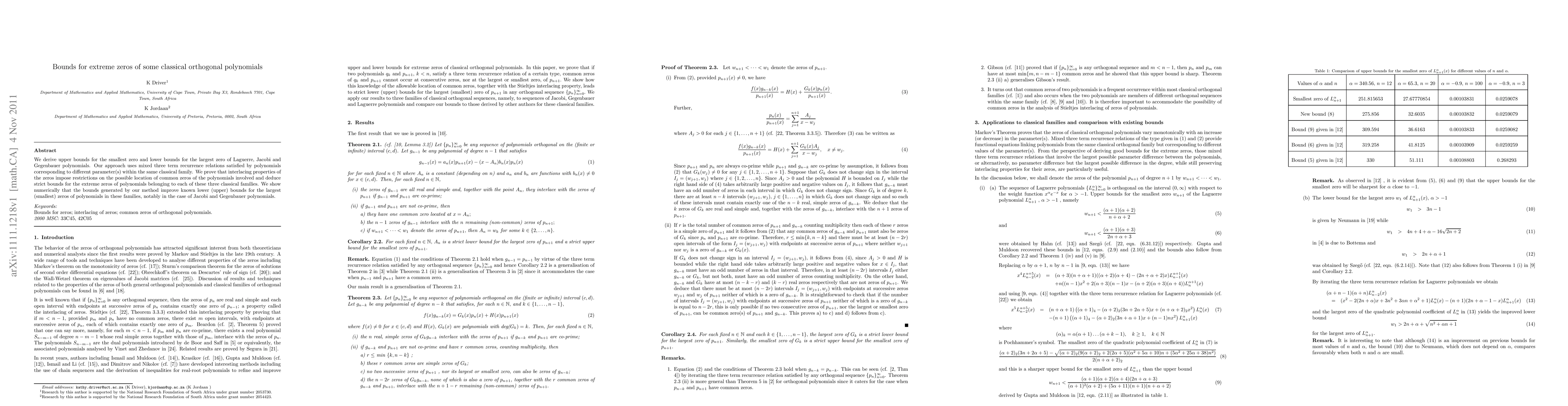 This paper provides improved bounds for the extreme zeros of Laguerre, Jacobi, and Gegenbauer polynomials using interlacing properties and mixed three-term recurrence relations. The derived bounds outperform existing methods, particularly for Jacobi and Gegenbauer polynomials.