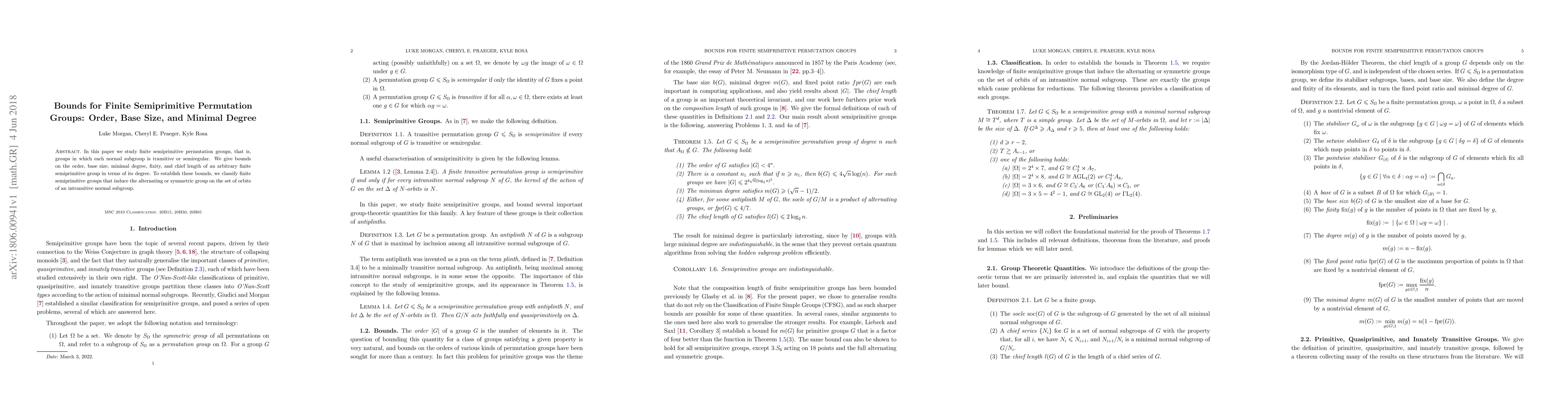 Summary: The paper provides bounds on various properties of finite semiprimitive permutation groups, focusing on order, base size, and minimal degree, classifying groups that induce the alternating or symmetric group on the set of orbits of an intransitive normal subgroup to establish these bounds.