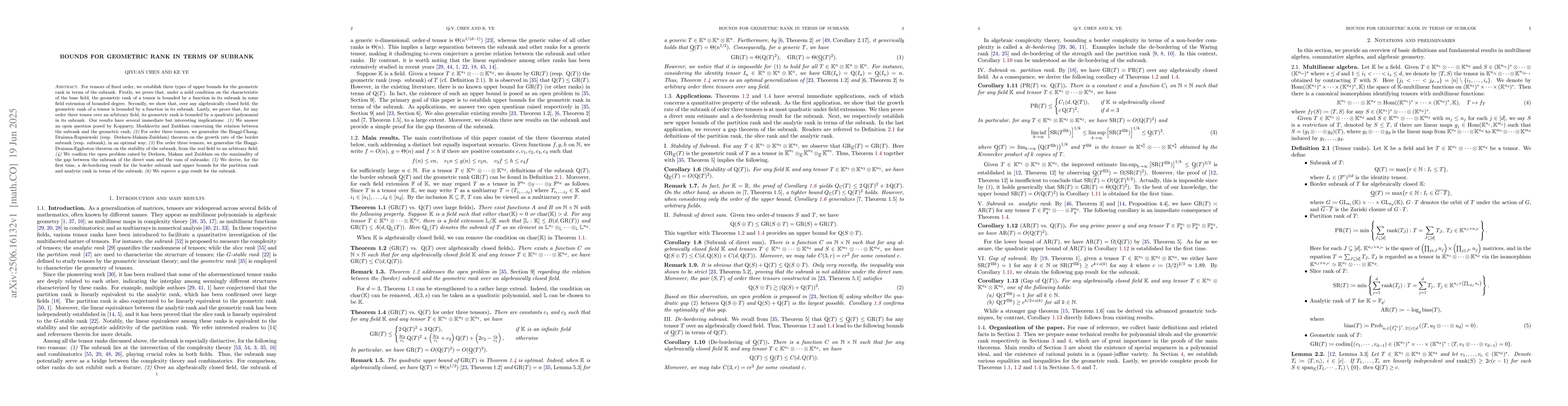 For tensors of fixed order, we establish three types of upper bounds for the geometric rank in terms of the subrank. Firstly, we prove that, under a mild condition on the characteristic of the base field, the geometric rank of a tensor is bounded by a function in its subrank in some field extension of bounded degree. Secondly, we show that, over any algebraically closed field, the geometric rank of a tensor is bounded by a function in its subrank. Lastly, we prove that, for any order three tensor over an arbitrary field, its geometric rank is bounded by a quadratic polynomial in its subrank. Our results have several immediate but interesting implications: (1) We answer an open question posed by Kopparty, Moshkovitz and Zuiddam concerning the relation between the subrank and the geometric rank; (2) For order three tensors, we generalize the Biaggi-Chang- Draisma-Rupniewski (resp. Derksen-Makam-Zuiddam) theorem on the growth rate of the border subrank (resp. subrank), in an optimal way; (3) For order three tensors, we generalize the Biaggi- Draisma-Eggleston theorem on the stability of the subrank, from the real field to an arbitrary field; (4) We confirm the open problem raised by Derksen, Makam and Zuiddam on the maximality of the gap between the subrank of the direct sum and the sum of subranks; (5) We derive, for the first time, a de-bordering result for the border subrank and upper bounds for the partition rank and analytic rank in terms of the subrank; (6) We reprove a gap result for the subrank.