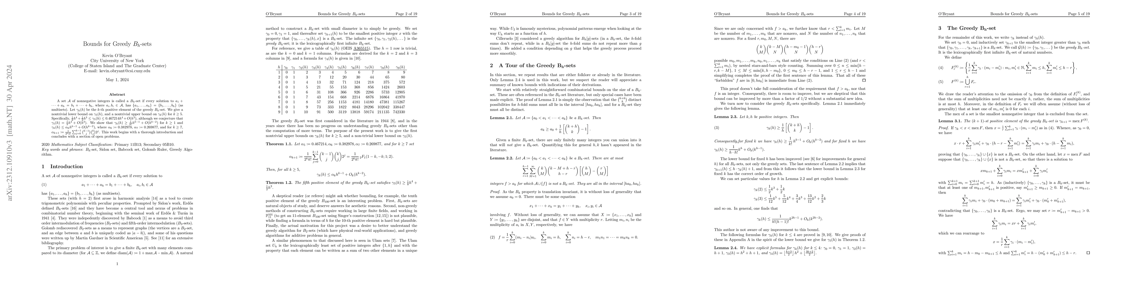 A set $A$ of nonnegative integers is called a $B_h$-set if every solution to $a_1+\dots+a_h = b_1+\dots+b_h$, where $a_i,b_i \in A$, has $\{a_1,\dots,a_h\}=\{b_1,\dots,b_h\}$ (as multisets). Let $\gamma_k(h)$ be the $k$-th positive element of the greedy $B_h$-set. We give a nontrivial lower bound on $\gamma_5(h)$, and a nontrivial upper bound on $\gamma_k(h)$ for $k\ge 5$. Specifically, $\frac 18 h^4 +\frac12 h^3 \le \gamma_5(h) \le 0.467214 h^4+O(h^3)$, although we conjecture that $\gamma_5(h)=\frac13 h^4 +O(h^3)$. We show that $\gamma_k(h) \ge \frac{1}{k!} h^{k-1} + O(h^{k-2})$ for $k\ge 1$ and $\gamma_k(h) \le \alpha_k h^{k-1}+O(h^{k-2})$, where $\alpha_6 := 0.382978$, $\alpha_7 := 0.269877$, and for $k\ge 7$, $\alpha_{k+1} := \frac{1}{2^k k!} \sum_{j=0}^{k-1} \binom{k-1}j\binom kj 2^j$. This work begins with a thorough introduction and concludes with a section of open problems.