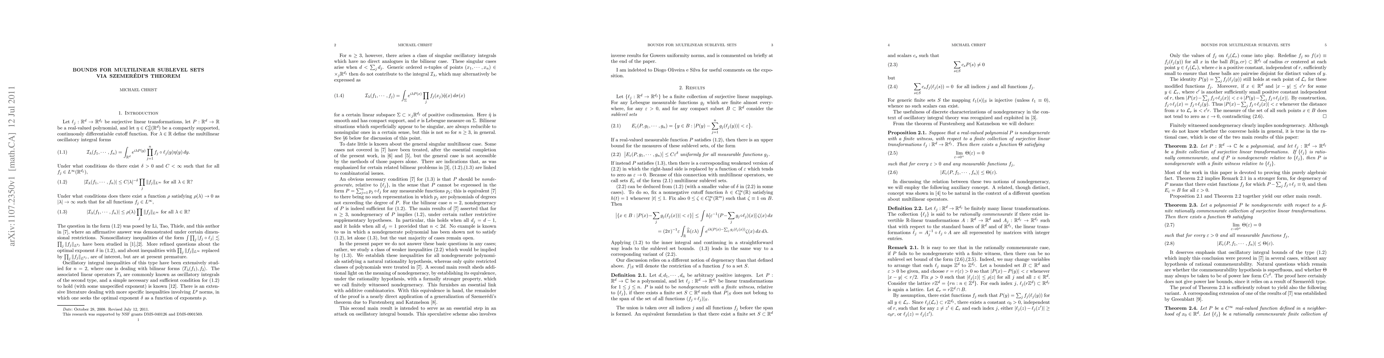 In 2005, Li, Tao, Thiele and the author raised a general question concerning upper bounds for a class of multilinear oscillatory integral operators, and established such bounds in a few cases. Most cases remain open. The present paper is concerned with sublevel set bounds, which would be a consequence of the oscillatory integral bounds, if valid. These sublevel set bounds are established here in a weak form but in nearly full generality, subject only to a rationality hypothesis. The proof relies on an extension of Szemeredi's theorem due to Furstenberg and Katznelson.