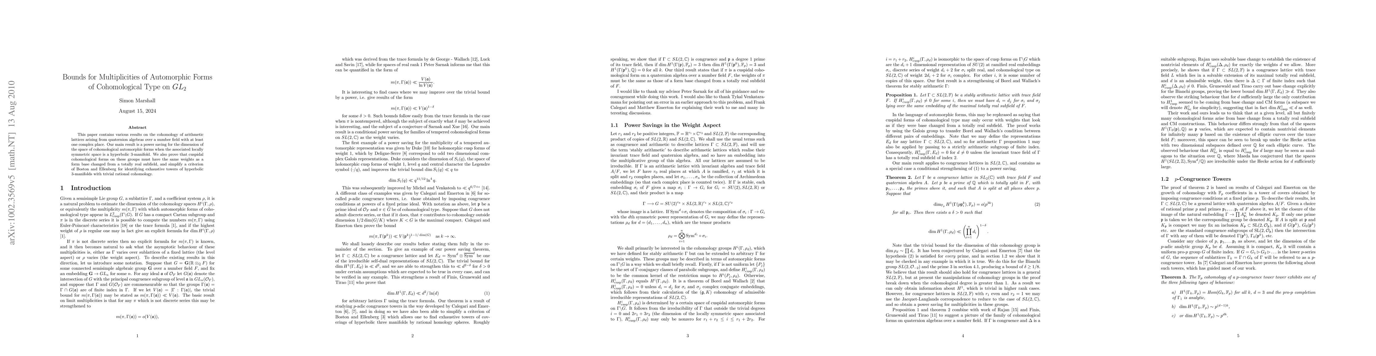 This paper establishes bounds for the multiplicities of cuspidal cohomological automorphic forms on GL_2, providing a strong restriction on their allowable weights and a conditional power saving for their multiplicities when associated with hyperbolic 3-manifolds.