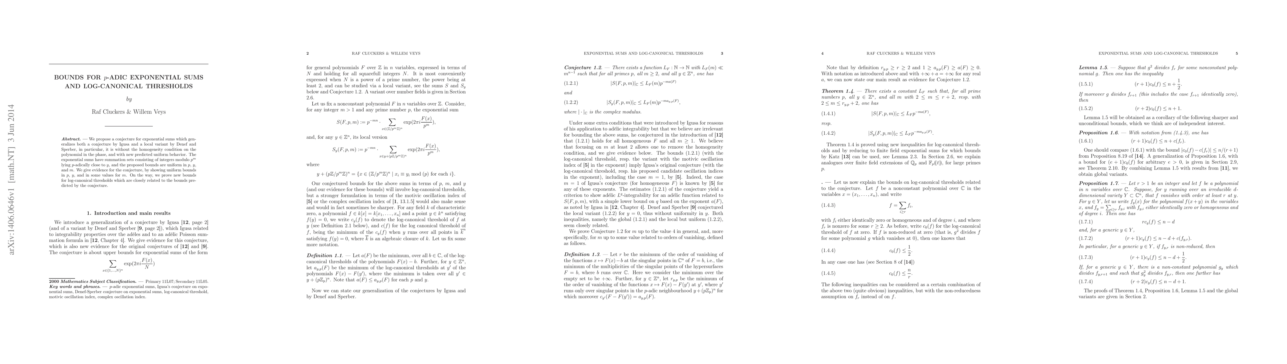 This paper proposes a new conjecture for p-adic exponential sums that generalizes existing conjectures by Igusa and Denef-Sperber, predicting uniform behavior without homogeneity conditions. It provides evidence for the conjecture with uniform bounds in p, y, and specific values of m, and also establishes new bounds for log-canonical thresholds.