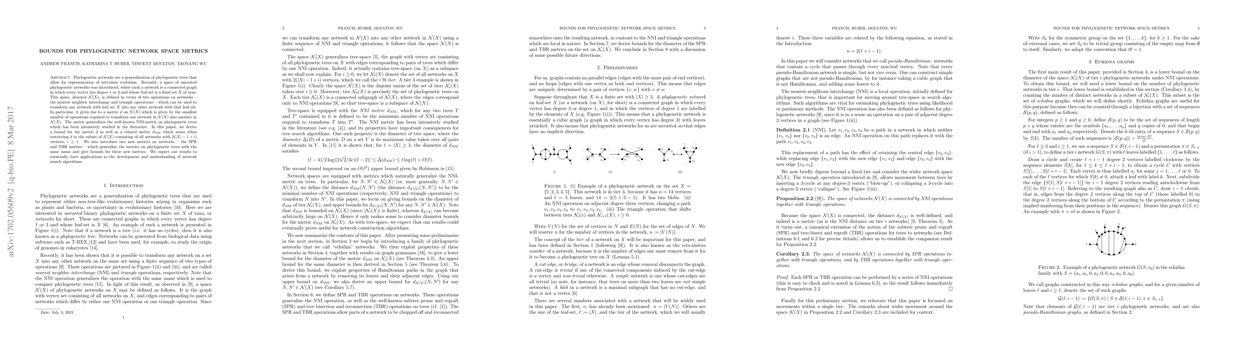 Phylogenetic networks are a generalization of phylogenetic trees that allow for representation of reticulate evolution. Recently, a space of unrooted phylogenetic networks was introduced, where such a network is a connected graph in which every vertex has degree 1 or 3 and whose leaf-set is a fixed set $X$ of taxa. This space, denoted $\mathcal{N}(X)$, is defined in terms of two operations on networks -- the nearest neighbor interchange and triangle operations -- which can be used to transform any network with leaf set $X$ into any other network with that leaf set. In particular, it gives rise to a metric $d$ on $\mathcal N(X)$ which is given by the smallest number of operations required to transform one network in $\mathcal N(X)$ into another in $\mathcal N(X)$. The metric generalizes the well-known NNI-metric on phylogenetic trees which has been intensively studied in the literature. In this paper, we derive a bound for the metric $d$ as well as a related metric $d_{N\!N\!I}$ which arises when restricting $d$ to the subset of $\mathcal{N}(X)$ consisting of all networks with $2(|X|-1+i)$ vertices, $i \ge 1$. We also introduce two new metrics on networks -- the SPR and TBR metrics -- which generalize the metrics on phylogenetic trees with the same name and give bounds for these new metrics. We expect our results to eventually have applications to the development and understanding of network search algorithms.