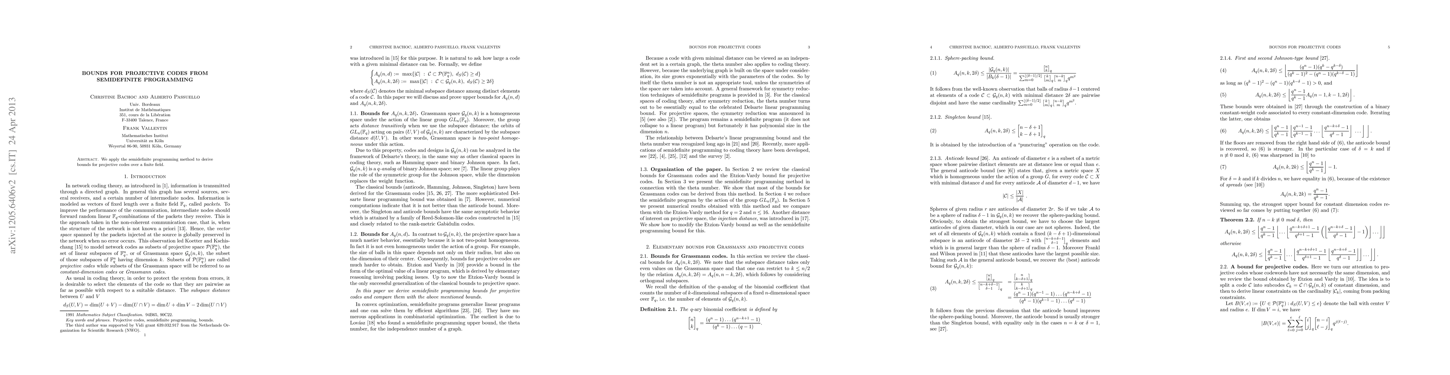 Summary: This paper utilizes semidefinite programming to establish new bounds for projective codes over finite fields, enhancing the understanding of their capacity and structure. The method provides a robust framework for evaluating these codes' performance.