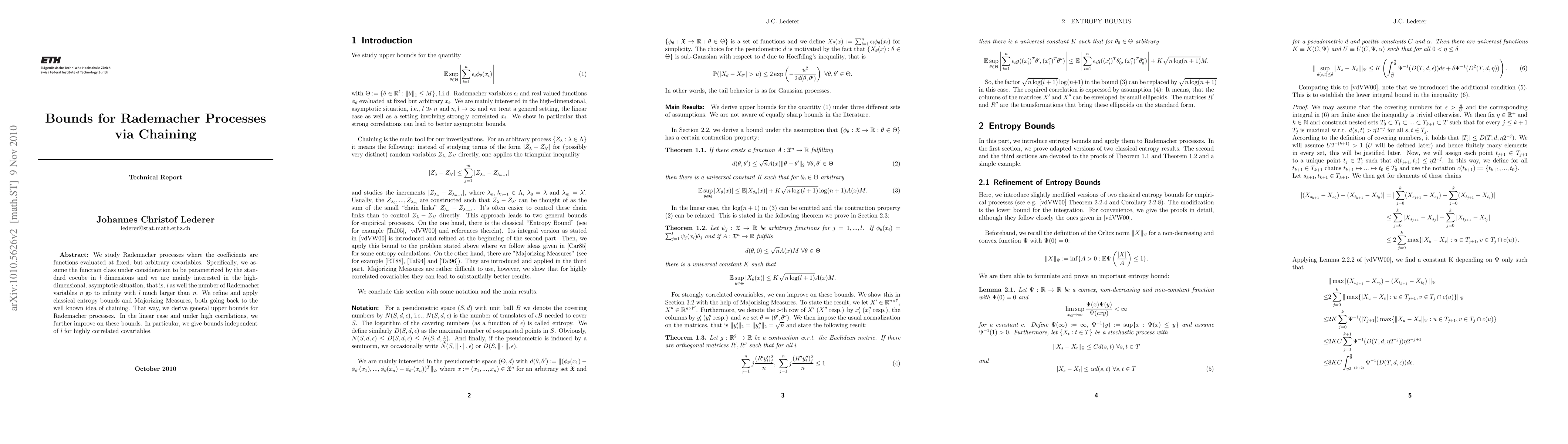 This paper refines classical entropy bounds and Majorizing Measures via chaining to derive upper bounds for Rademacher processes, focusing on high-dimensional scenarios where the number of dimensions greatly exceeds the number of variables. It improves these bounds for the linear case under high correlations, providing bounds independent of the dimension for highly correlated variables.